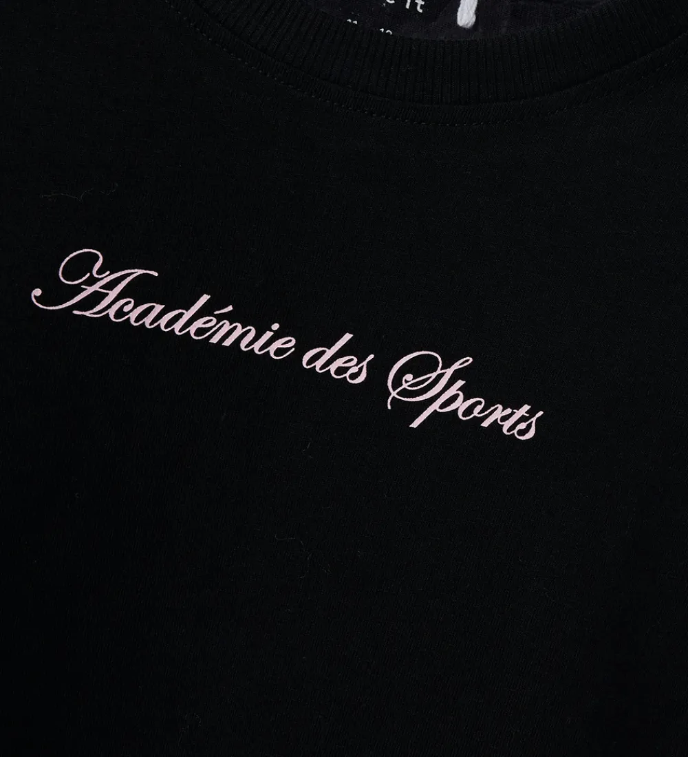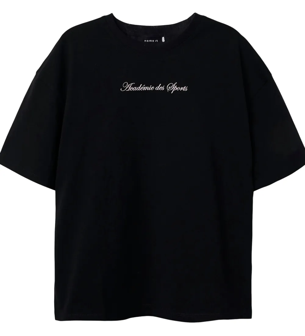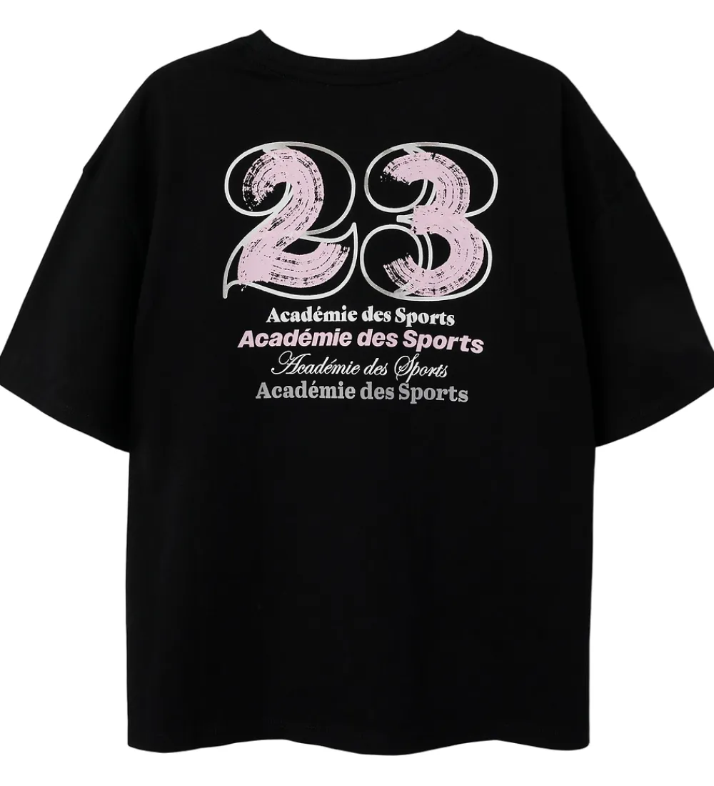 Elegant Name It t-shirt i sort med pink print på fronten med teksten “Académie des Sports”. På ryggen er der et stort print med tallet “23” i hvid og rosa og samme tekstprint med forskellige skrifttyper og farver. Name It t-shirten er designet med en rund halsudskæring og korte ærmer, som gør den enkel og tidløs i sin fremtoning.