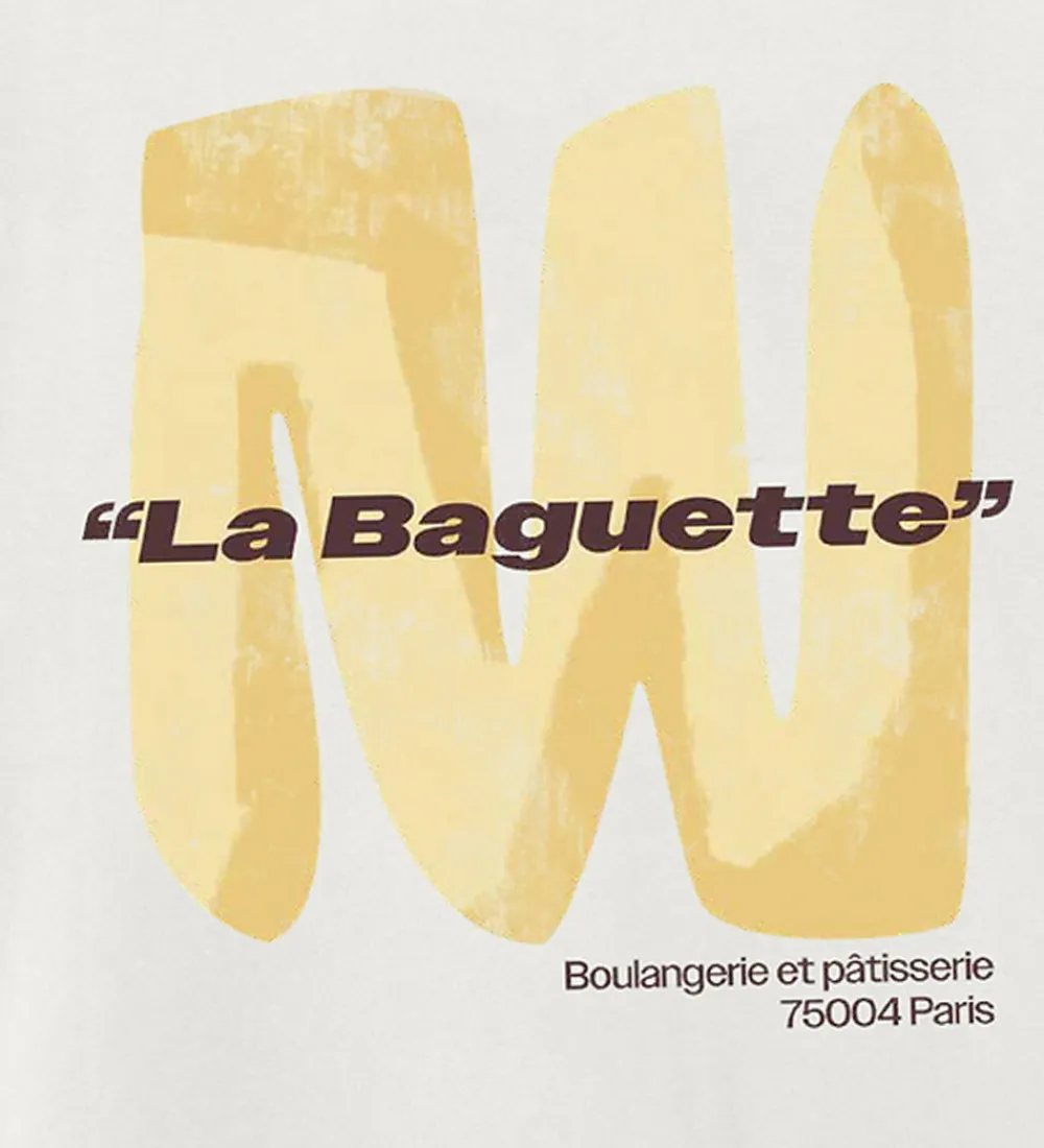 Flot Name It t-shirt i hvid med teksten “La Baguette” i mørkebrun på venstre bryst. På ryggen er der et stort gult print og tekstprint i mørkebrun. Name It t-shirten har en klassisk rund halsudskæring og korte ærmer.