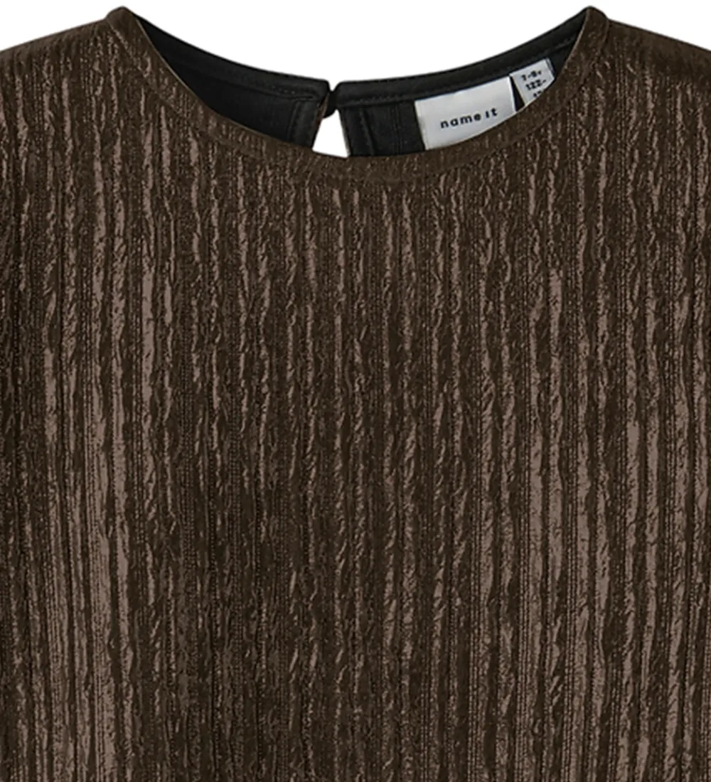 Elegant Name It t-shirt i en smuk kobberbrun nuance. T-shirten har en karakteristisk riflet struktur, som giver et unikt visuelt udtryk. Name It t-shirten har en rund halsudskæring med en pæn kant og dråbeåbning i nakken, hvilket giver et stilfuldt look. Den enkle skæring gør t-shirten let at bære til forskellige anledninger. Det klassiske design kombineret med den spændende tekstur giver et tidløst udseende.
