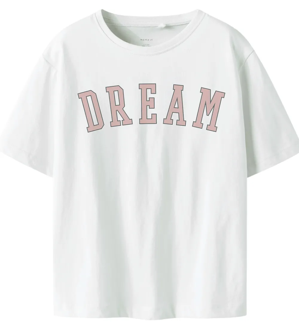Fin Name It t-shirt i klassisk hvid med teksten “DREAM” i rosa, der giver et enkelt, men iøjnefaldende udtryk. Name It t-shirten har en rund halsudskæring med en diskret ribkant, hvilket giver et stilrent look.