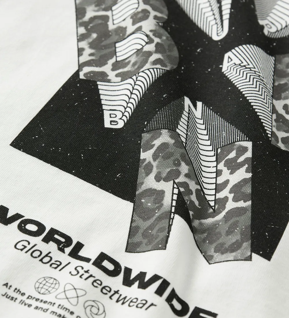 Moderne Name It t-shirt i hvid med et iøjnefaldende sort og gråt grafisk print på forsiden, der giver den et unikt udtryk. Det abstrakte design kombinerer forskellige mønstre, herunder leopardprint og striber. Name It t-shirten har en rund halsudskæring med ribkant.