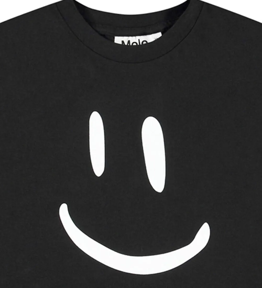 Moderne Molo t-shirt i sort. T-shirten har et enkelt og stilrent design med et stort, hvidt smileyprint på fronten, der skaber et positivt udtryk. Molo t-shirten har korte ærmer og en rund halsudskæring, der afsluttes med en smal ribkant.