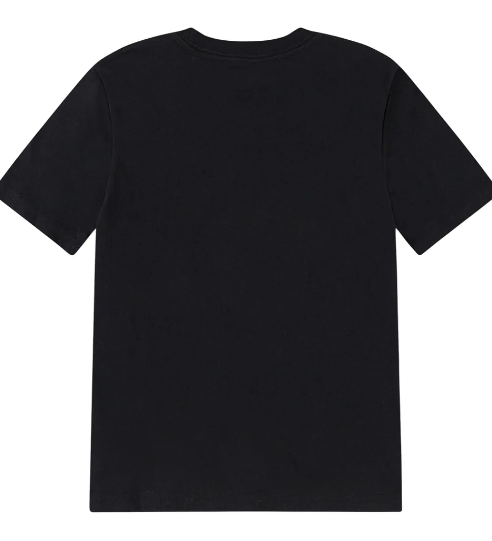 Smart Nike t-shirt i sort. T-shirten præsenterer et farverigt print med en karakter, der står på et skateboard, omgivet af dynamiske stænk i blå nuancer. Centralt på t-shirten ses teksten “Just Do It.” i stor, iøjnefaldende guld skrift. Nike t-shirten har en klassisk rund halsudskæring med en ribkant, der giver den et stilrent look.