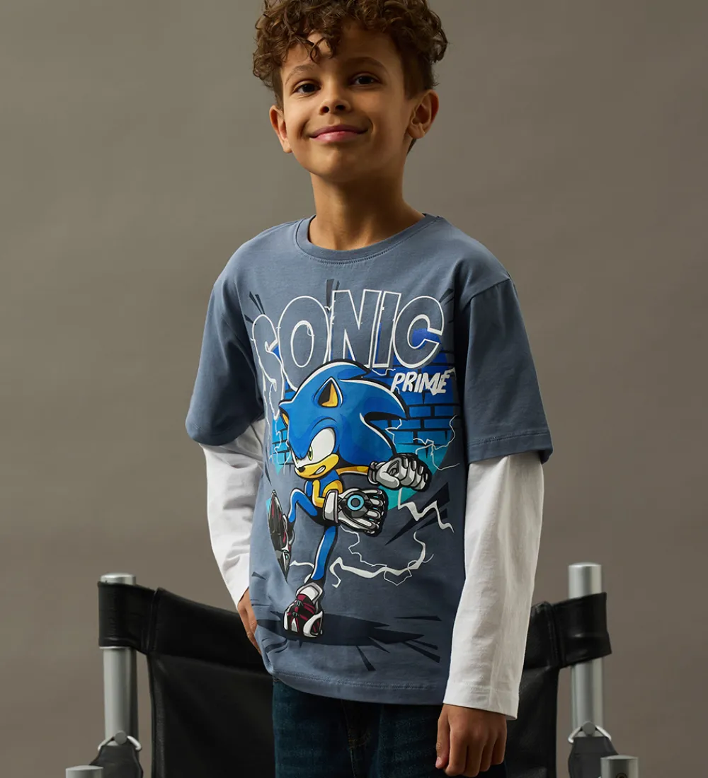 Sej Name It t-shirt i støvet mørkeblå. T-shirten har et stort print fra Netflix-serien Sonic Prime på fronten. Name It t-shirten er designet med en klassisk rund halsudskæring og korte ærmer, hvilket giver et enkelt og moderne look.