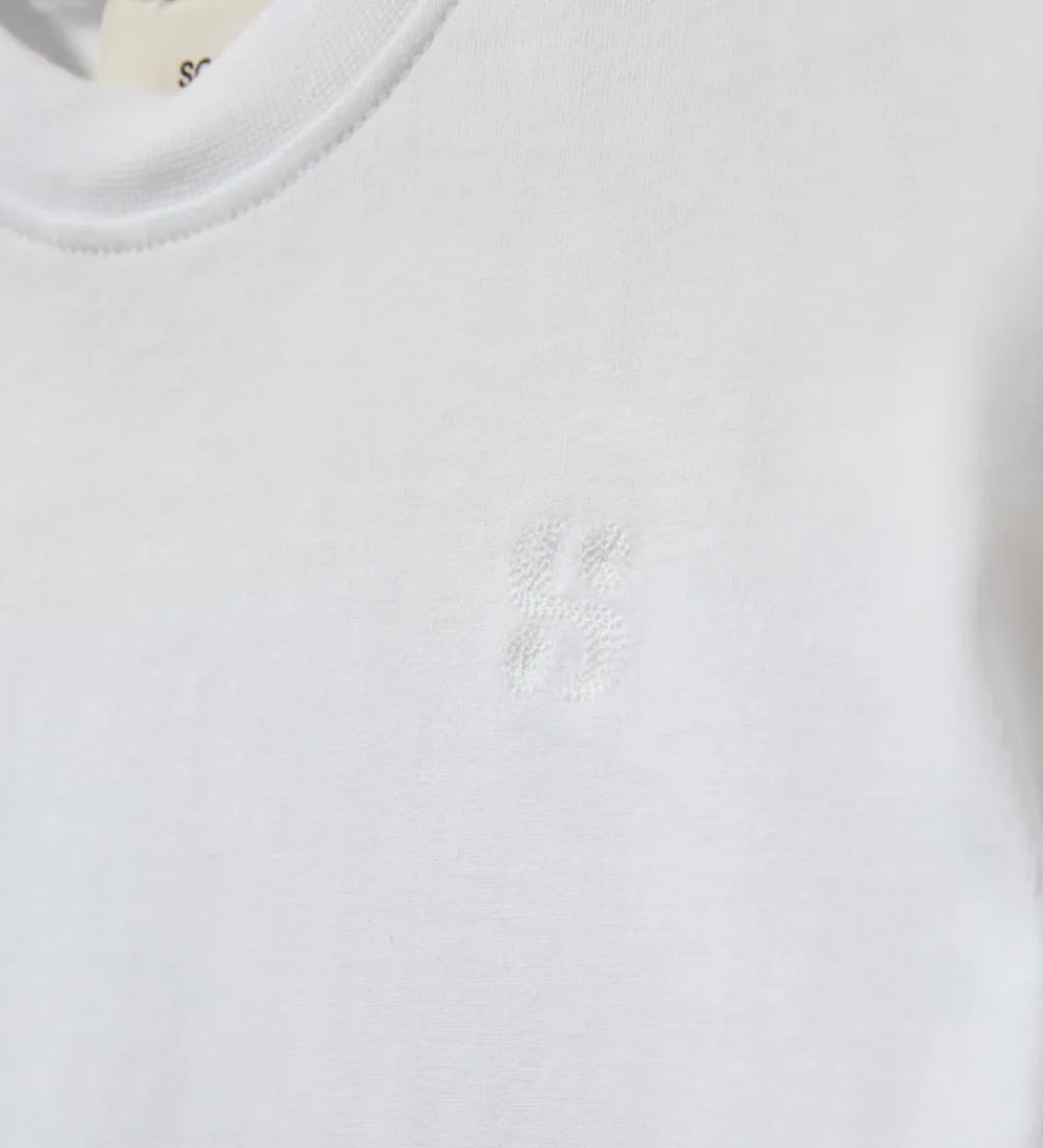 Elegant Sofie Schnoor t-shirt i en enkel hvid nuance med et diskret broderet logo på venstre bryst. T-shirten er designet med korte ærmer og en klassisk rund halsudskæring. Den fremstår med et stilrent look, der er let at integrere i garderoben.