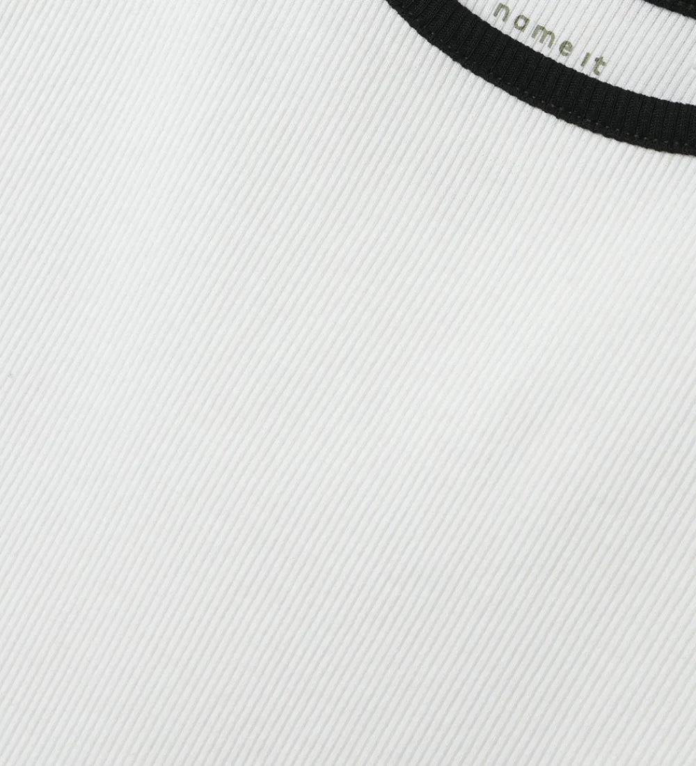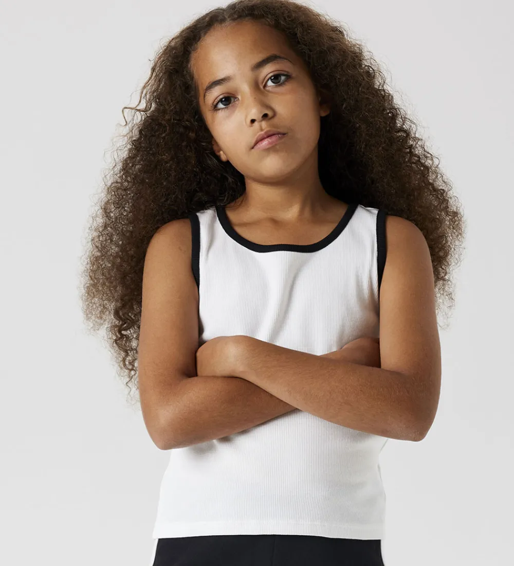 Behagelig Name It tanktop i en hvid nuance med sorte kanter og ribstruktur. Tanktoppen er ærmeløs, hvilket giver en let og luftig følelse. Et stilrent valg fra Name It, der nemt passer ind i garderoben.