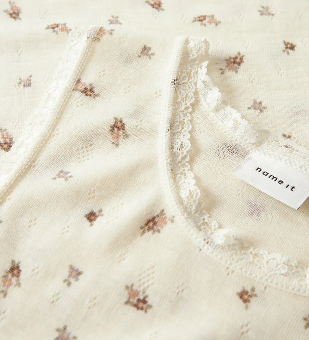 Elegant Name It undertrøje i råhvid med et fint, småblomstret mønster. Undertrøjen har en blød struktur og fine kanter ved halsudskæringen. Name It tilbyder her et design med et subtilt print, der tilføjer et stilfuldt touch. Undertrøjen er fremstillet af lækkert merinould.