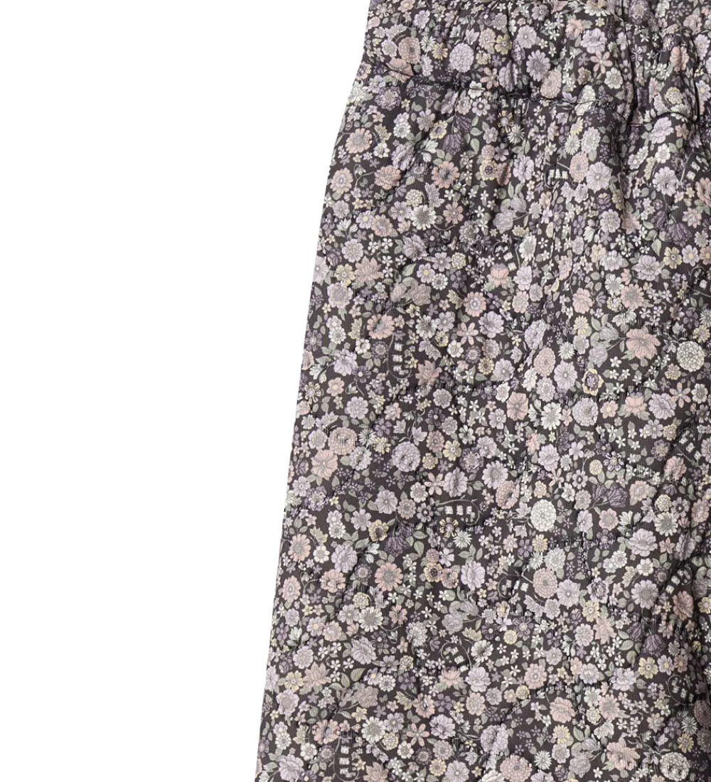 Flotte Wheat termobukser i mørk koksgrå med et alloverblomsterprint i støvede lilla, rosa og grønne nuancer samt ribkanter i støvet lilla. Termobukserne har en bølgende, quiltet struktur.