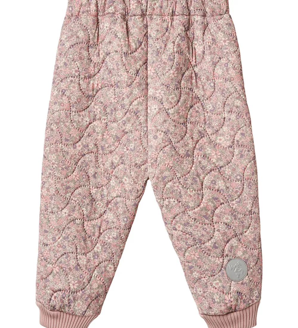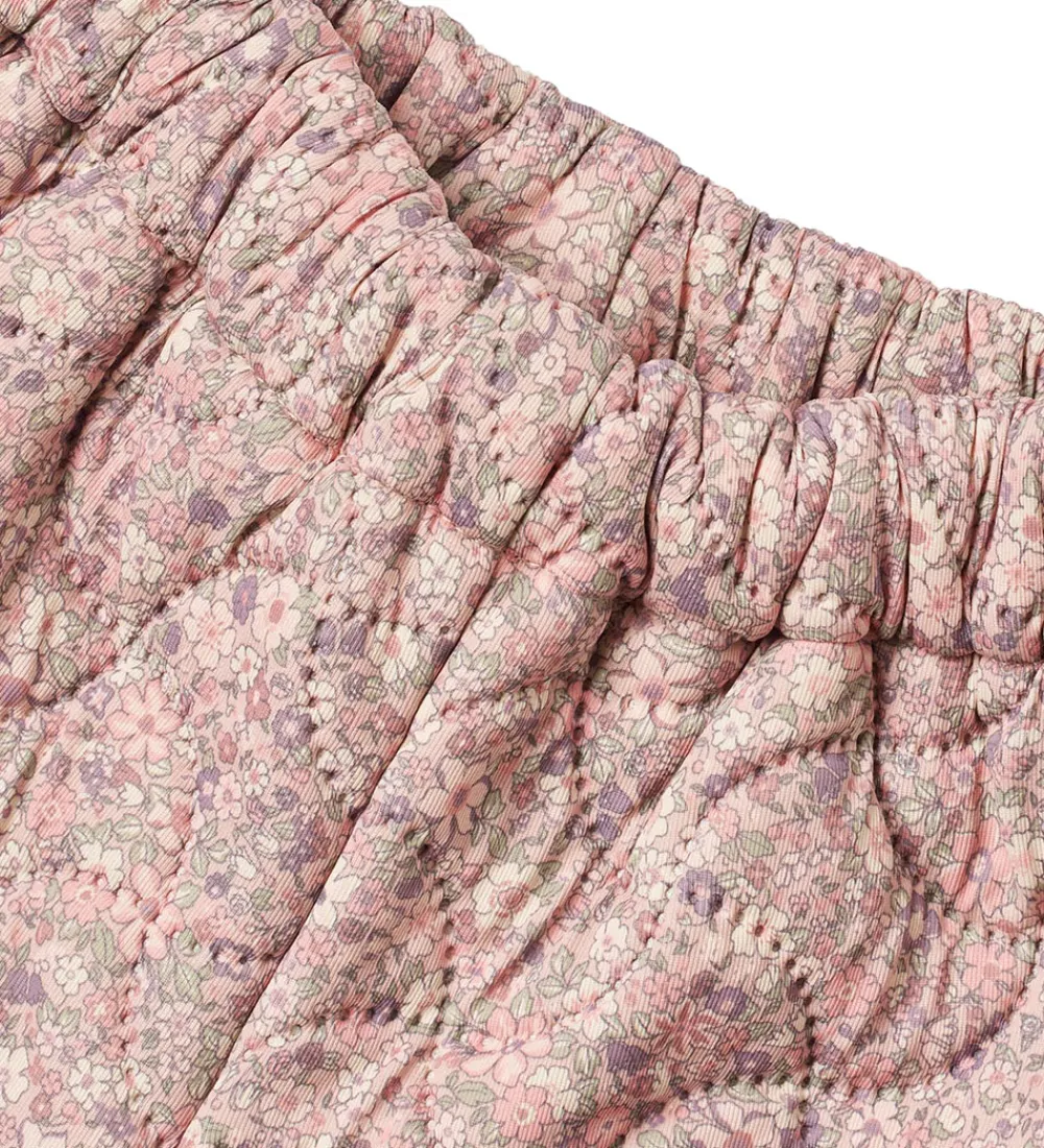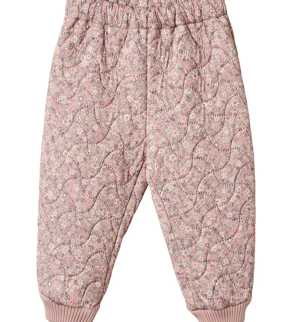 Skønne Wheat termobukser i rosa med et alloverblomsterprint. Termobukserne har en bølgende, quiltet struktur.
