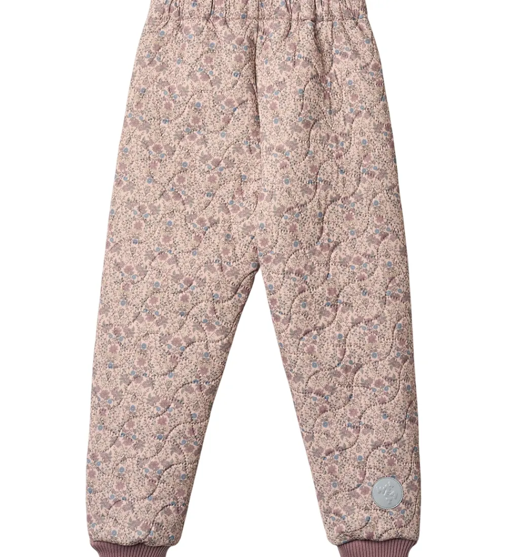 Flotte Wheat termobukser i lys rosa med et alloverblomsterprint i støvede lilla, blå og grønne nuancer og med ribkanter i støvet lilla. Termobukserne har en bølgende, quiltet struktur.