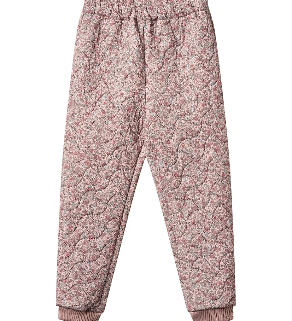 Flotte Wheat termobukser i rosa med et alloverblomsterprint i lyseblå, grønne, hvide og rosa nuancer. Termobukserne har en bølgende, quiltet struktur.