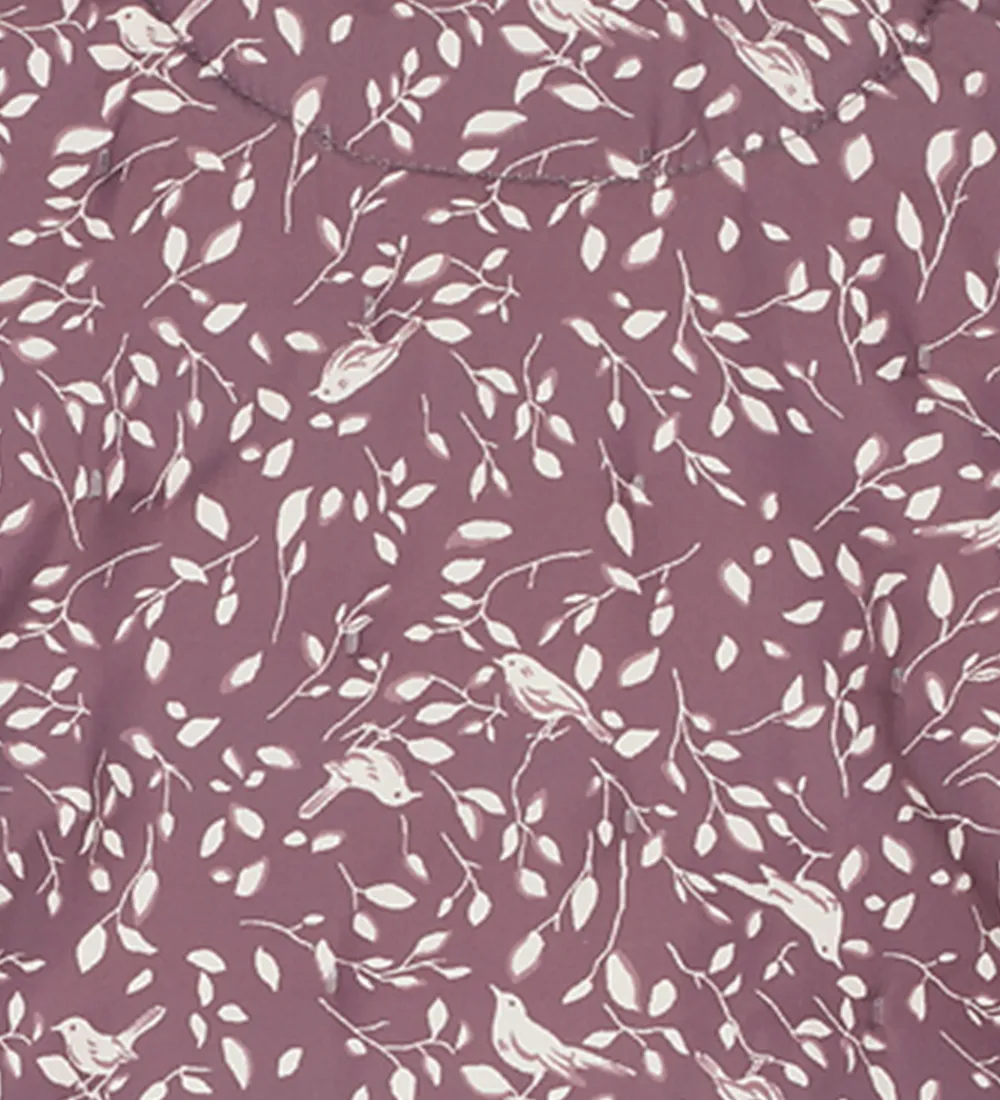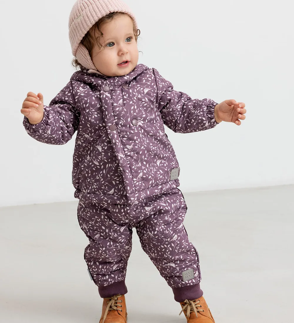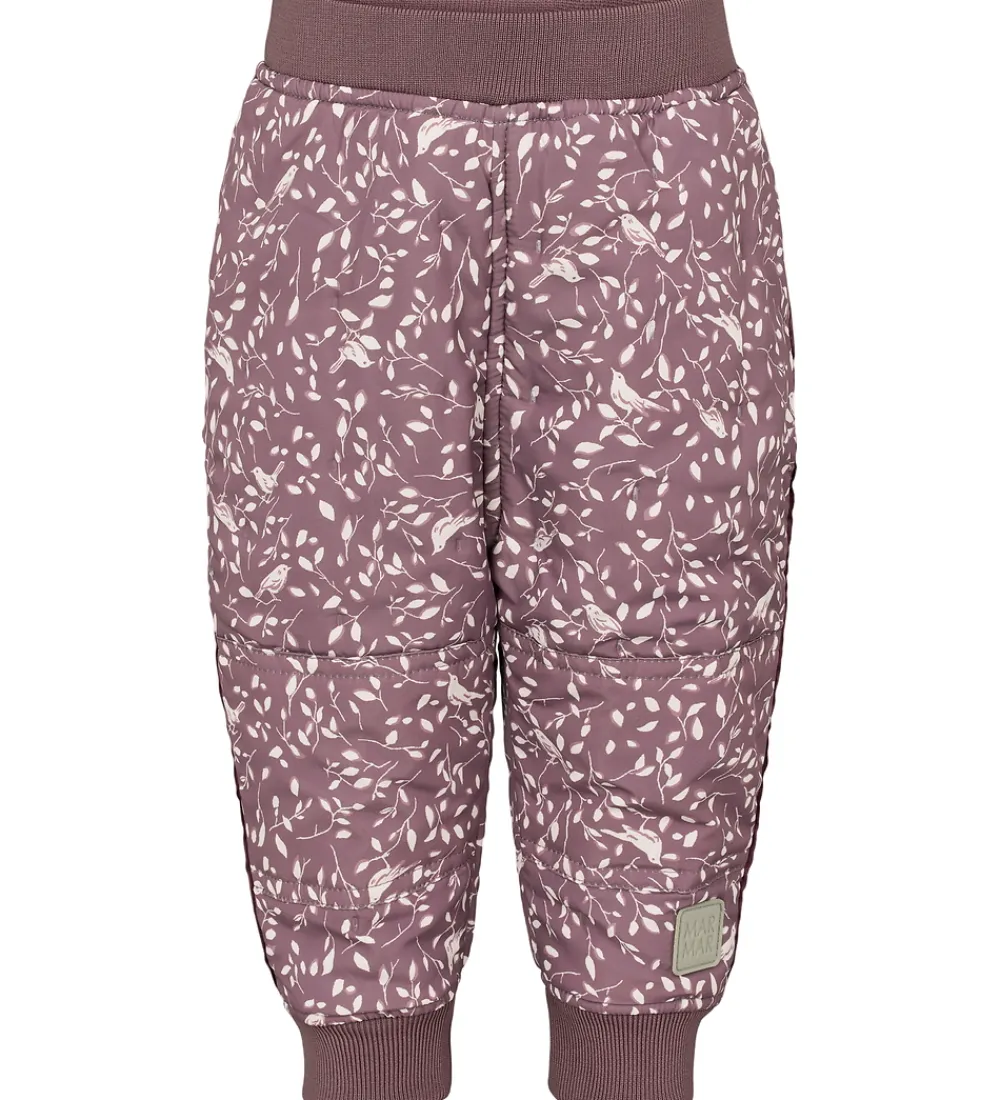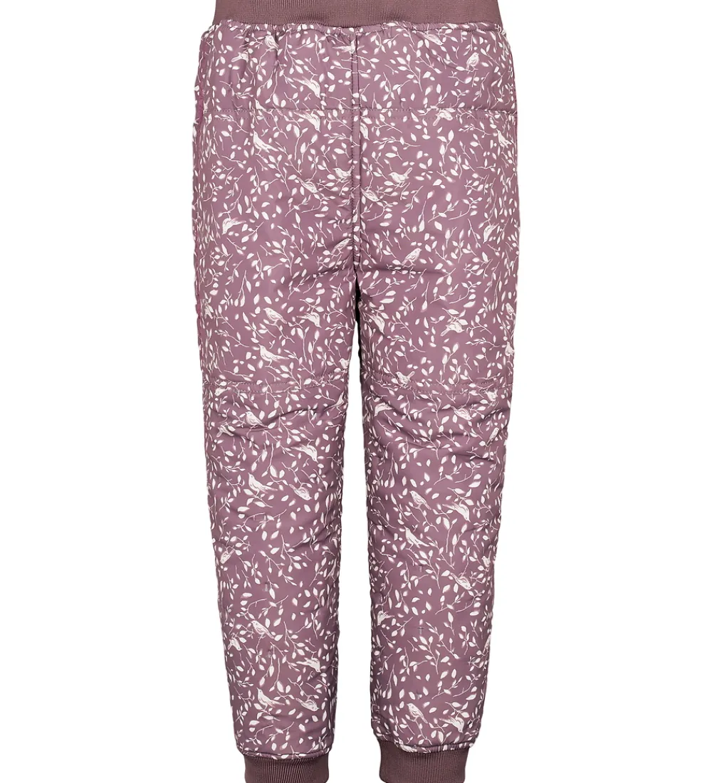 Søde MarMar termobukser i lilla med alloverprint i rosa med blade og fugle.