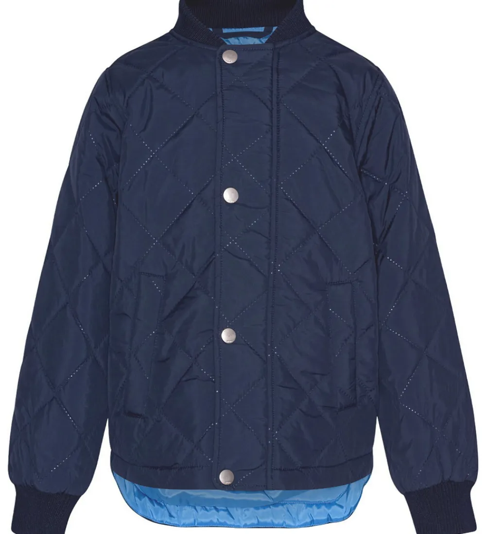 Skøn Molo termojakke i mørkeblå med et quiltet mønster, og indvendigt er den i en fin lyseblå farve.