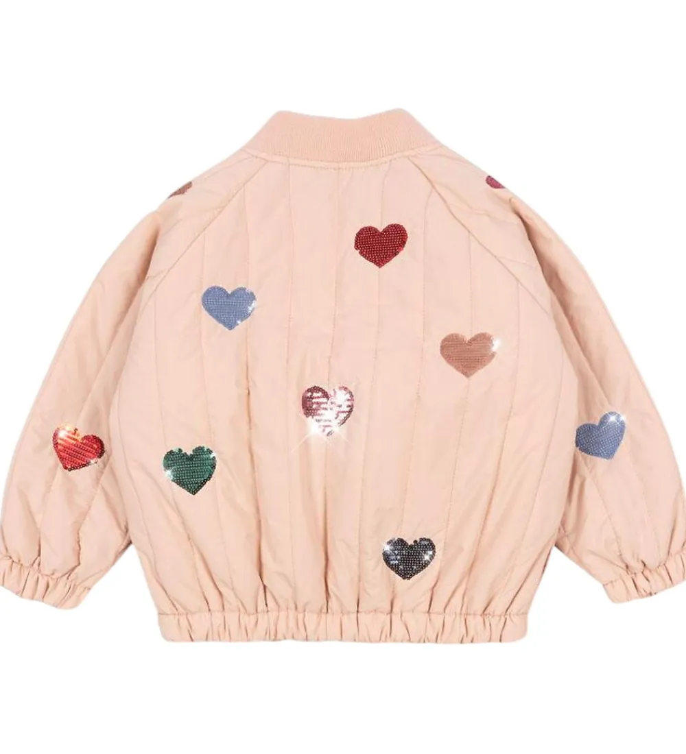 Fin Konges Sløjd termojakke i qulitet lysebeige, og med et farverigt alloverprint af paliethjerter.