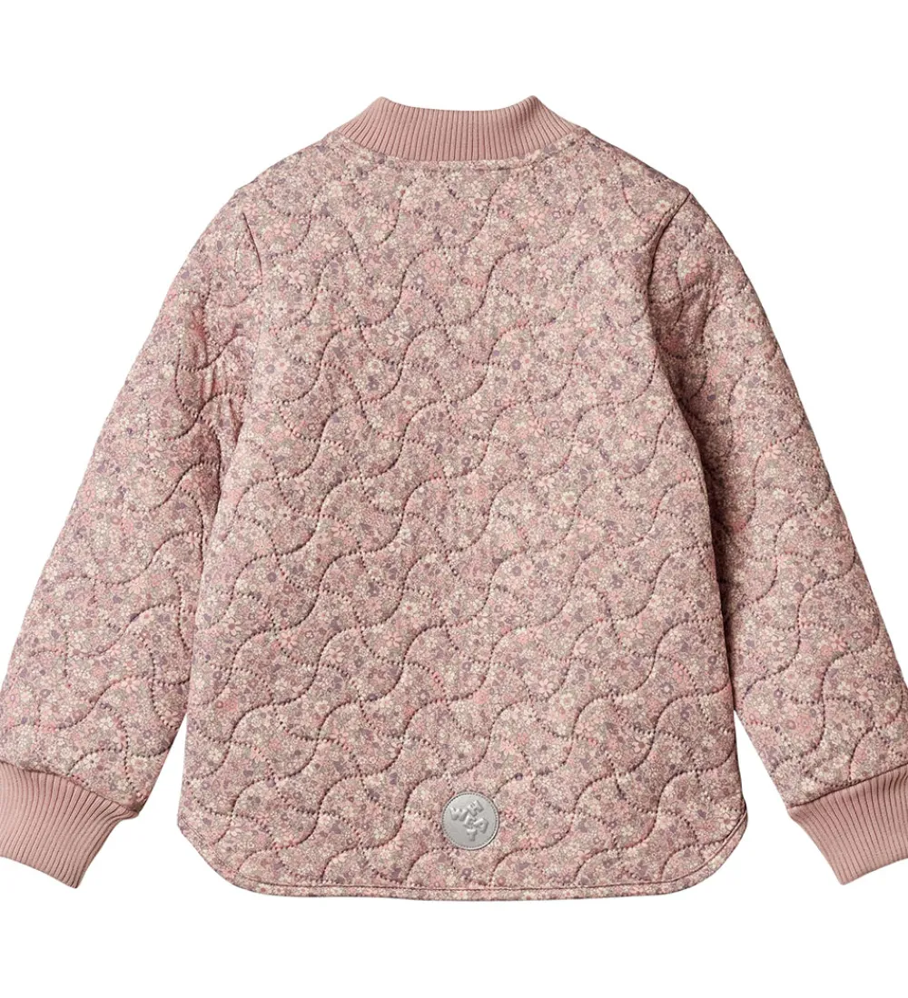 Fin Wheat termojakke i rosa med et alloverblomsterprint og en bølgende, quiltet struktur.