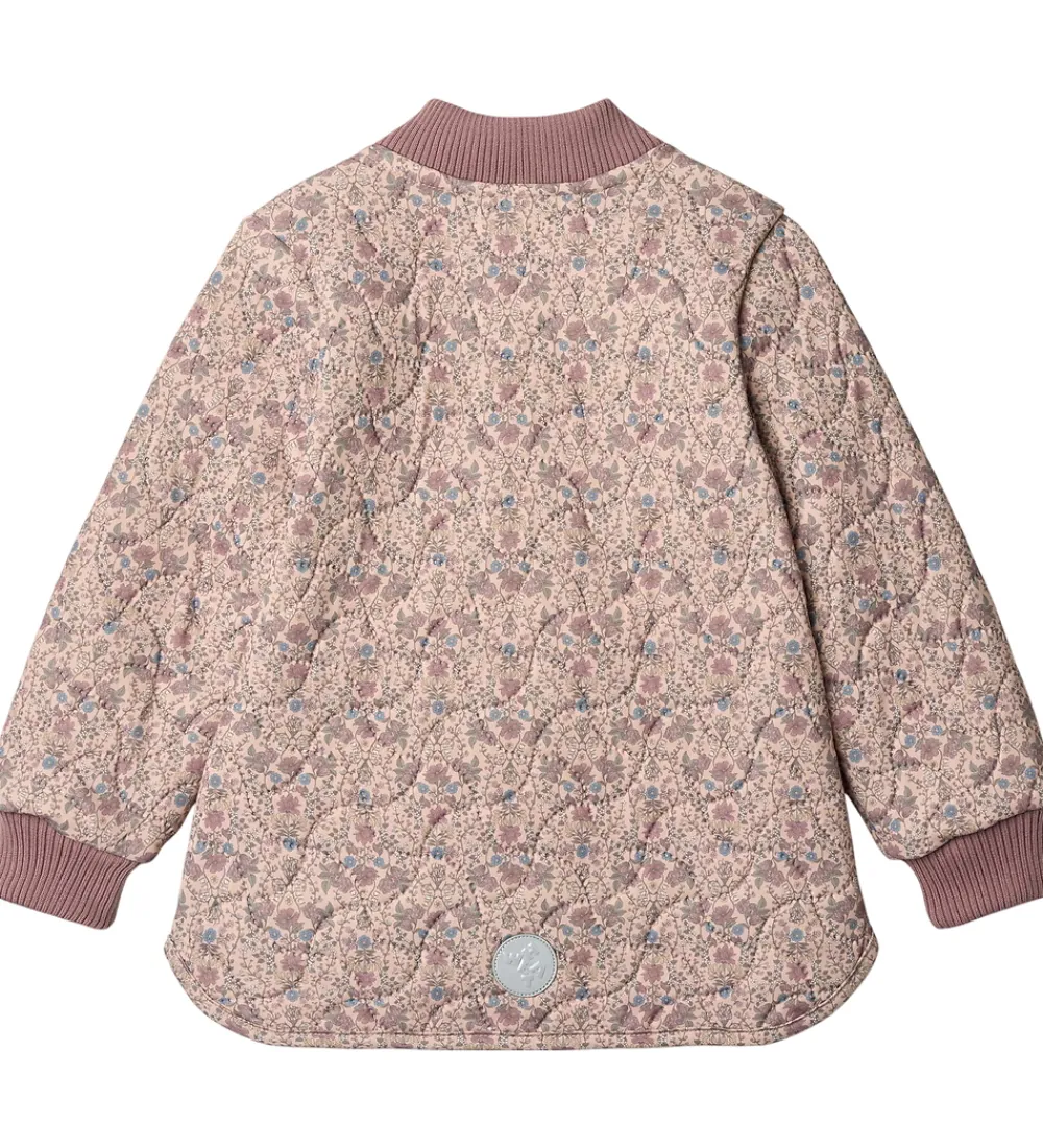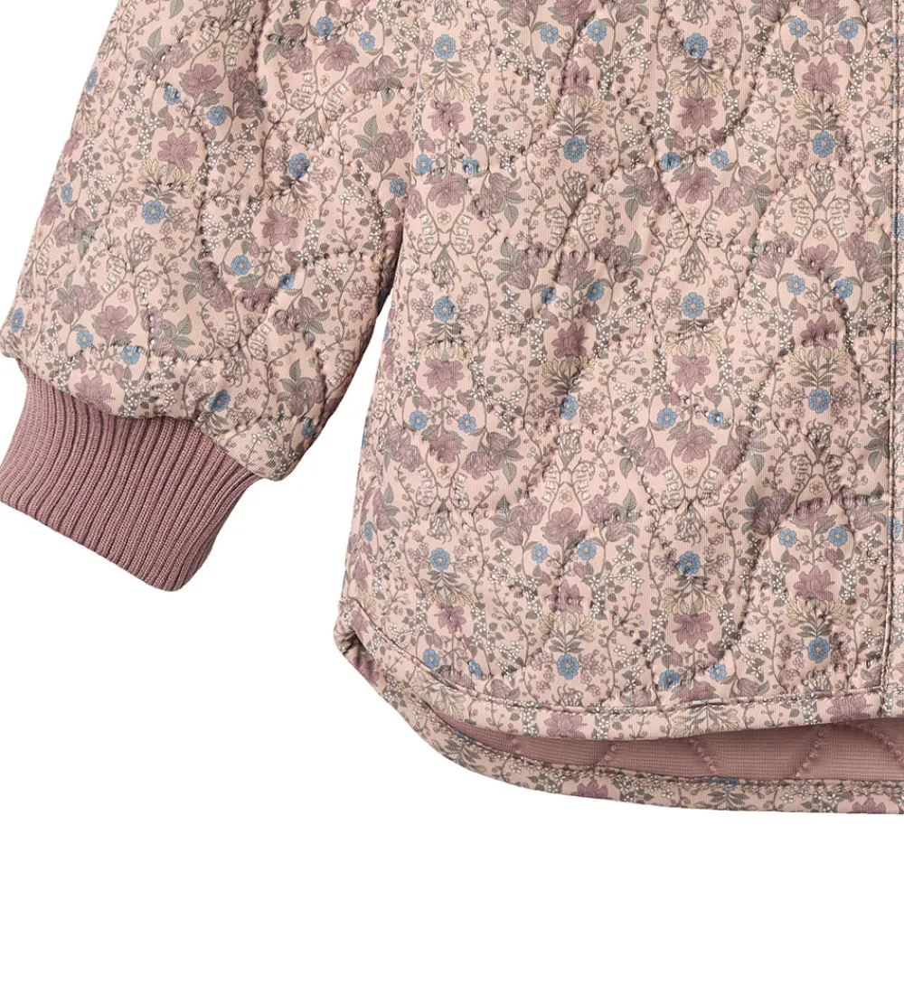 Skøn Wheat termojakke i lys rosa med et alloverblomsterprint i støvede lilla, blå og grønne nuancer og med ribkanter i støvet lilla. Termojakken har en bølgende, quiltet struktur.