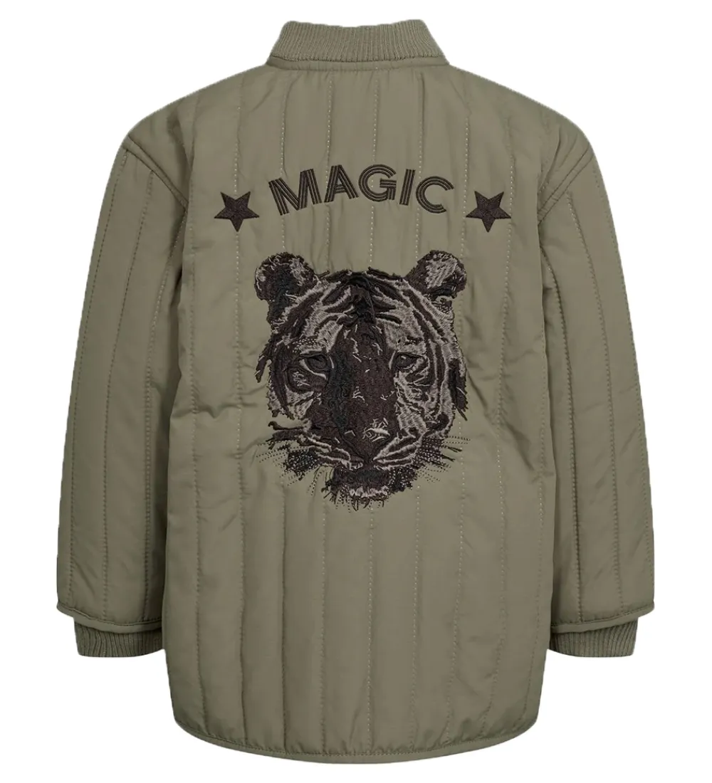 Skøn Petit by Sofie Schnoor termojakke i armygrøn med en broderet tiger og teksten “MAGIC” på ryggen. Termojakken er med en quiltet struktur.