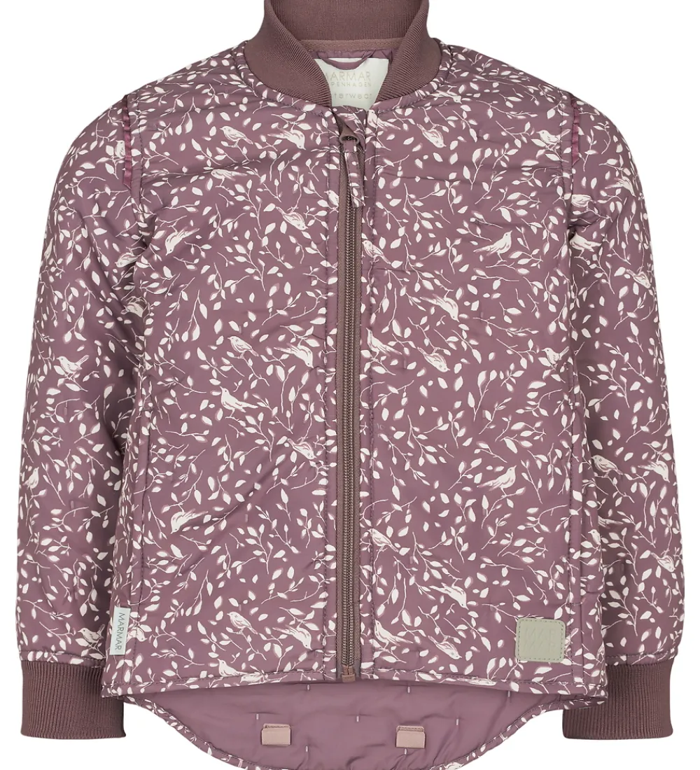 Sød MarMar termojakke i lilla med alloverprint i rosa med blade og fugle.