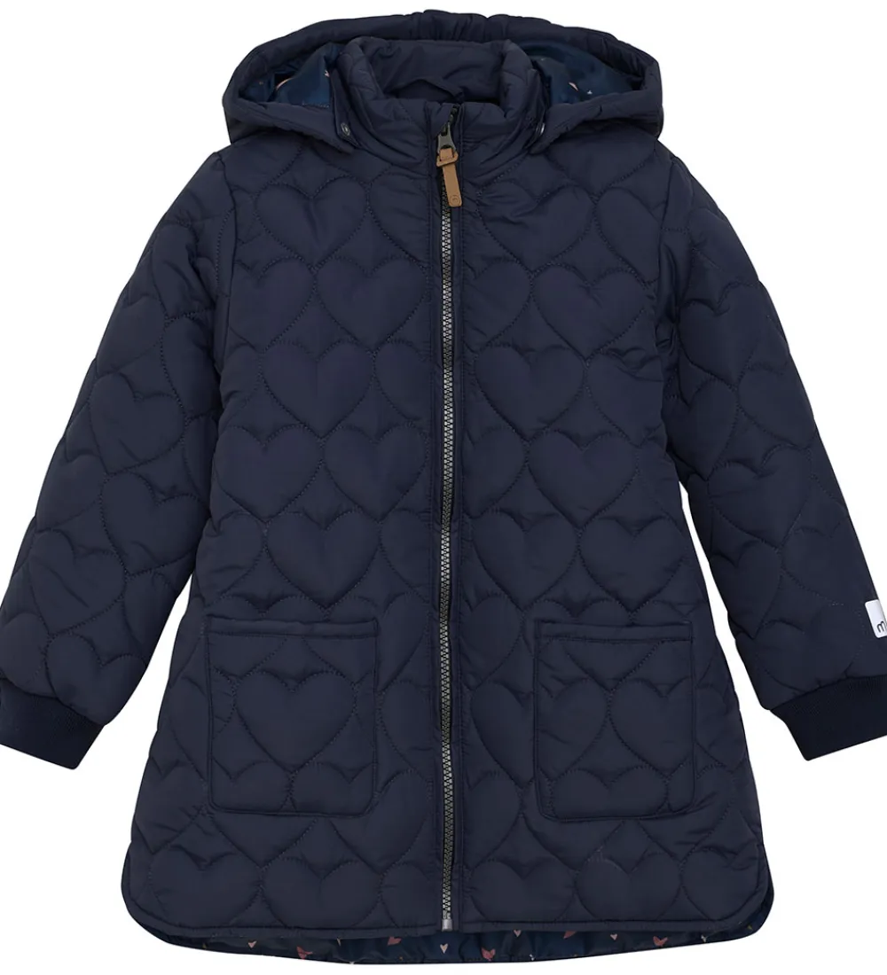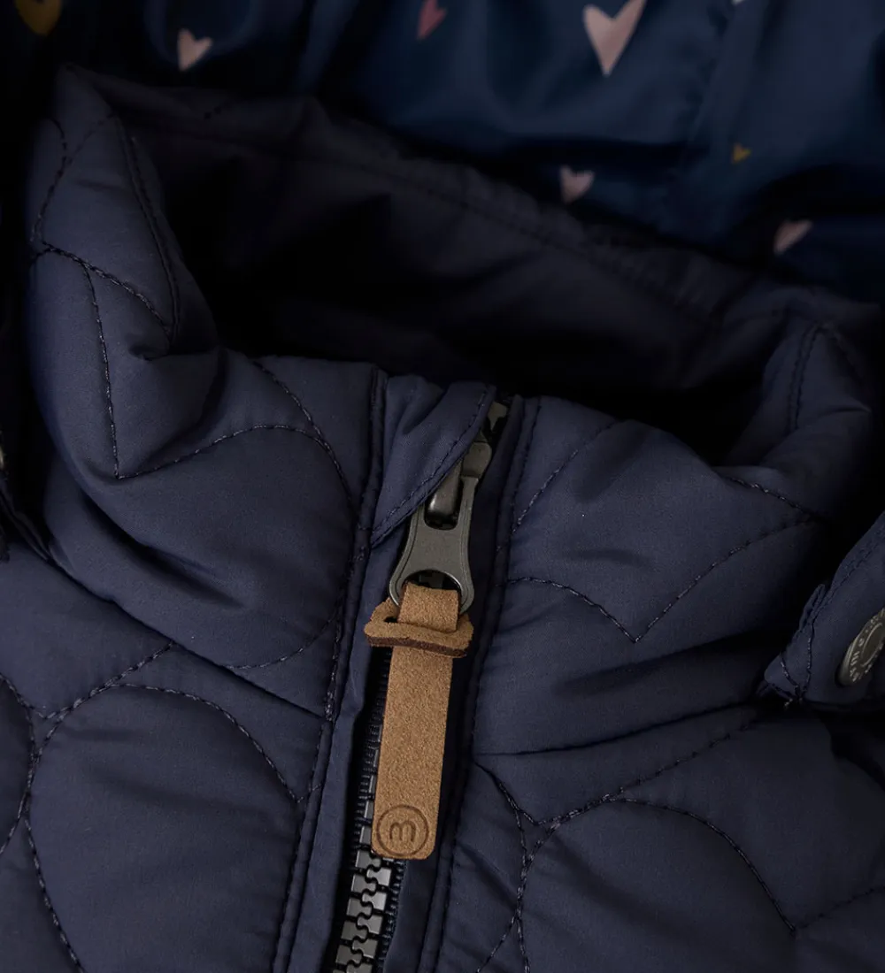 Praktisk Minymo termojakke i navyblå med hjerteformet quiltet struktur.
