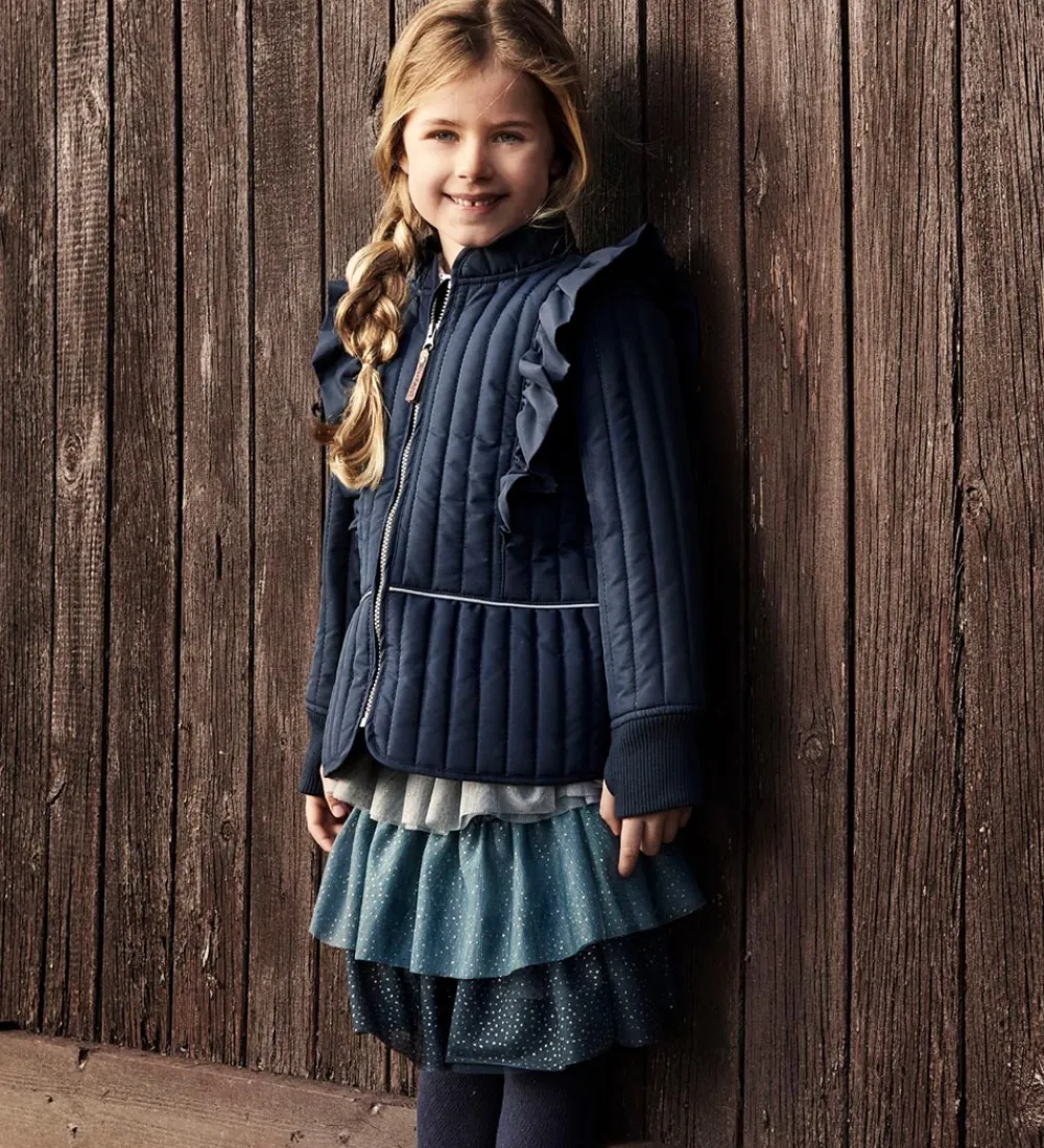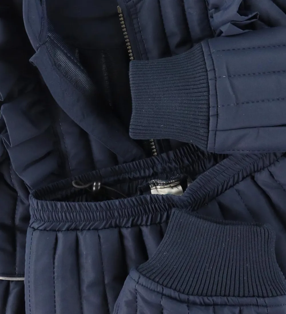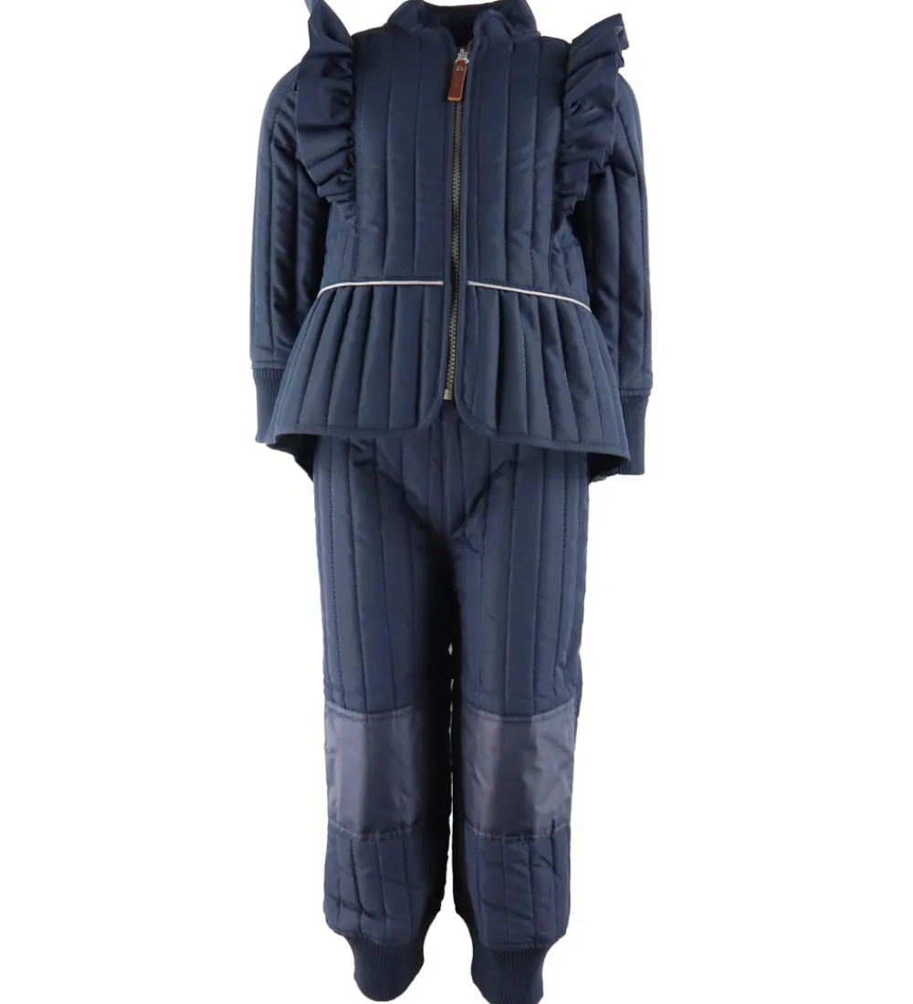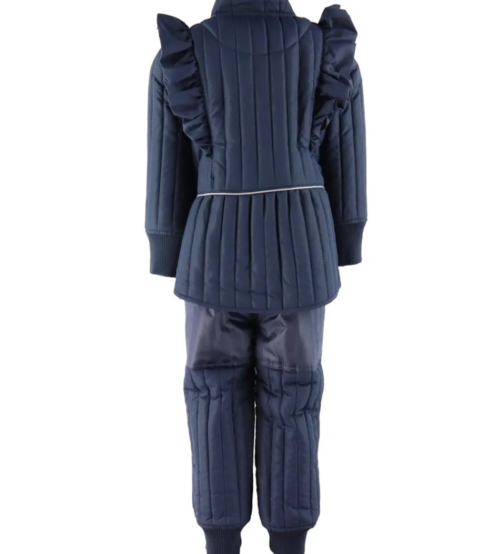 Skønt En Fant termotøj i navyblå med lodrette syninger og flotte flæse omkring skuldrene. Sættet består af både en termojakke og et par termobukser.
