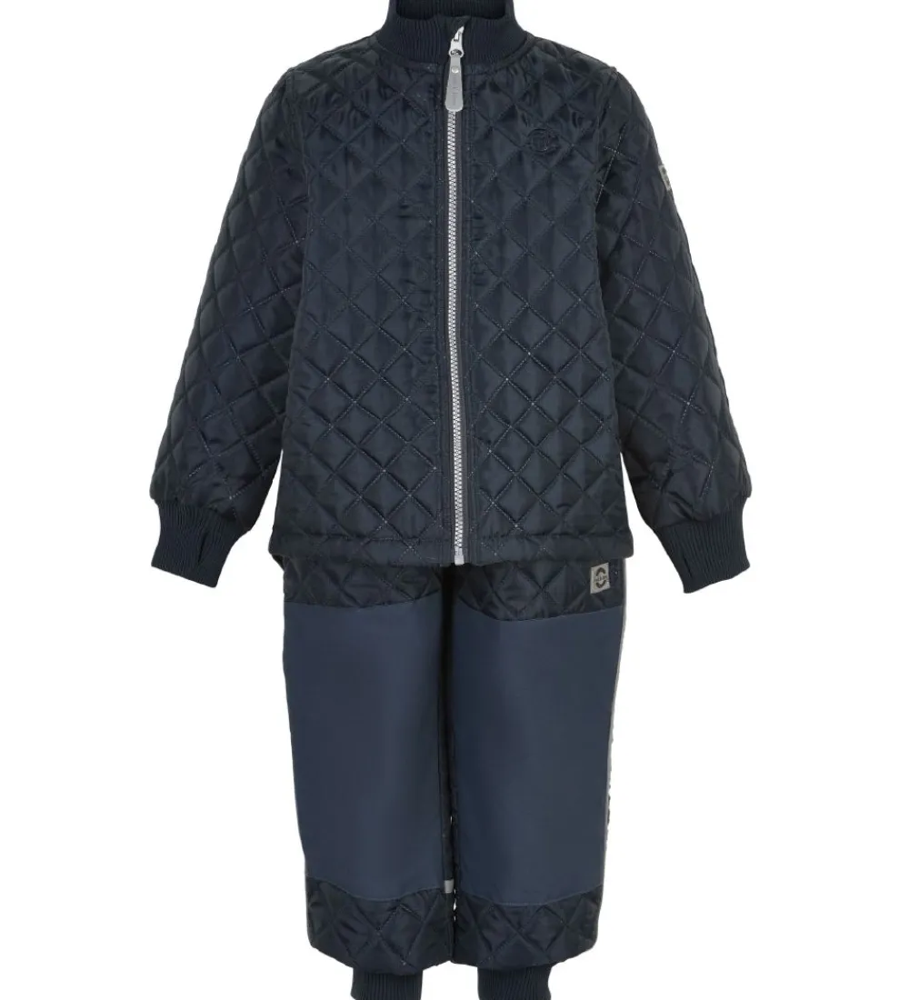 Smukt Mikk-Line termotøj bestående af en termojakke og et par termobukser i navy med en quiltet struktur.