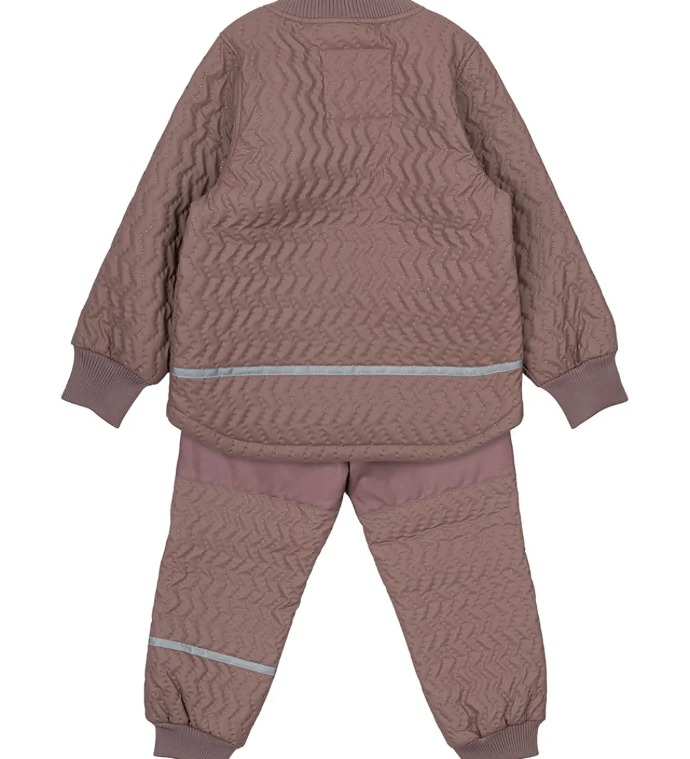 Lækkert Mikk-Line termotøj bestående af en termojakke og et par termobukser i støvet lilla. Termotøjet har en struktur af striber med indprægede, små prikker.