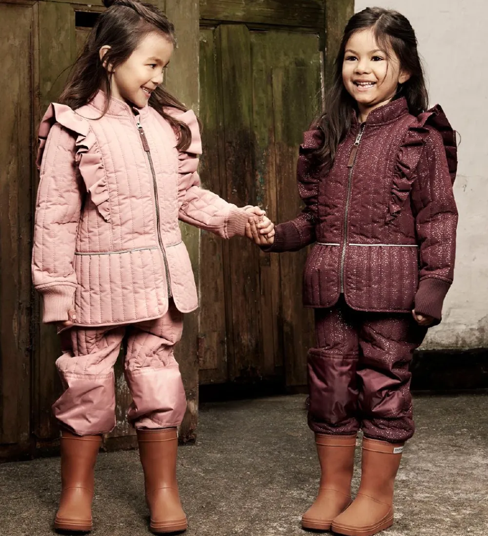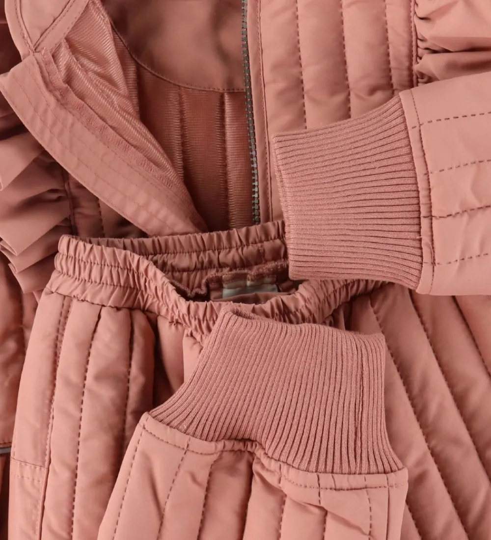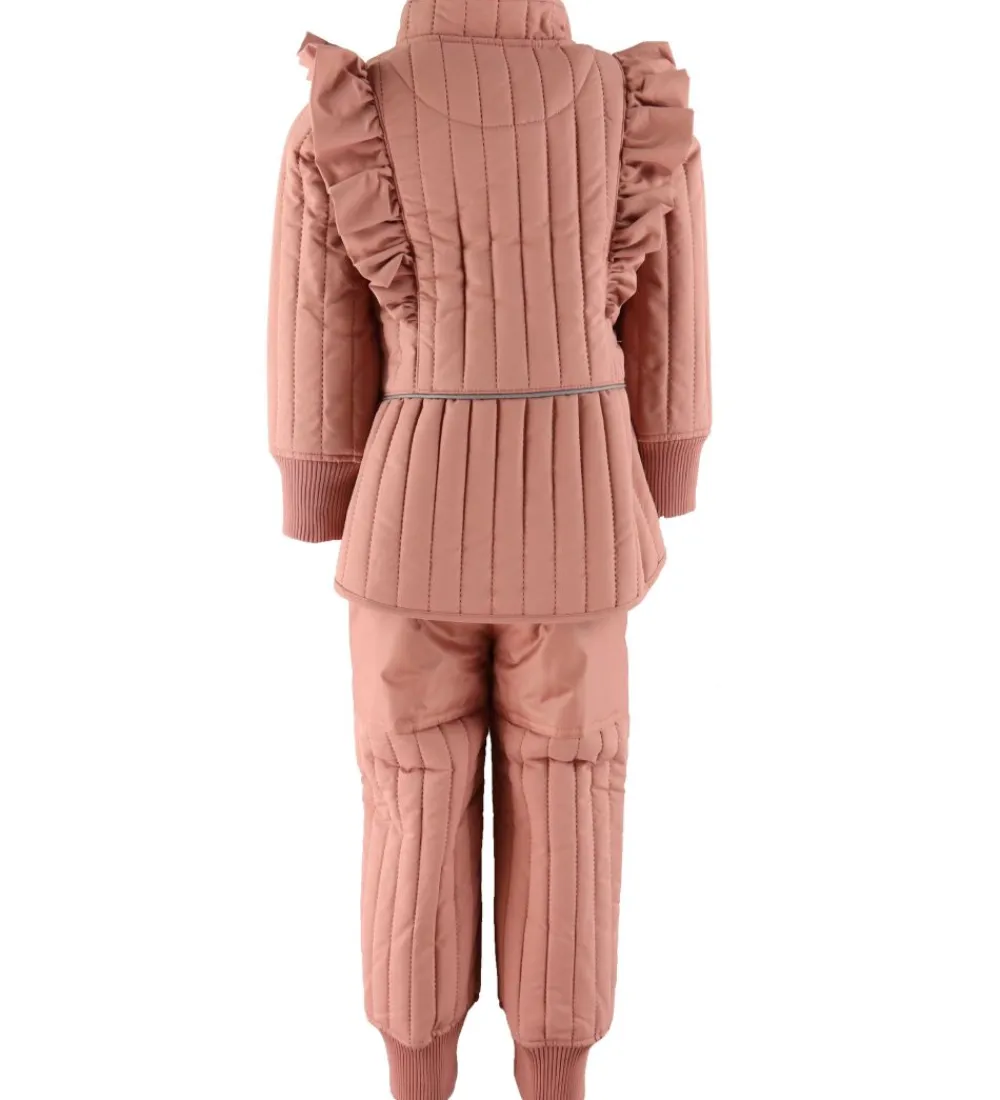 Skønt En Fant termotøj i rosa med lodrette syninger og flotte flæse omkring skuldrene. Sættet består af både en termojakke og et par termobukser.