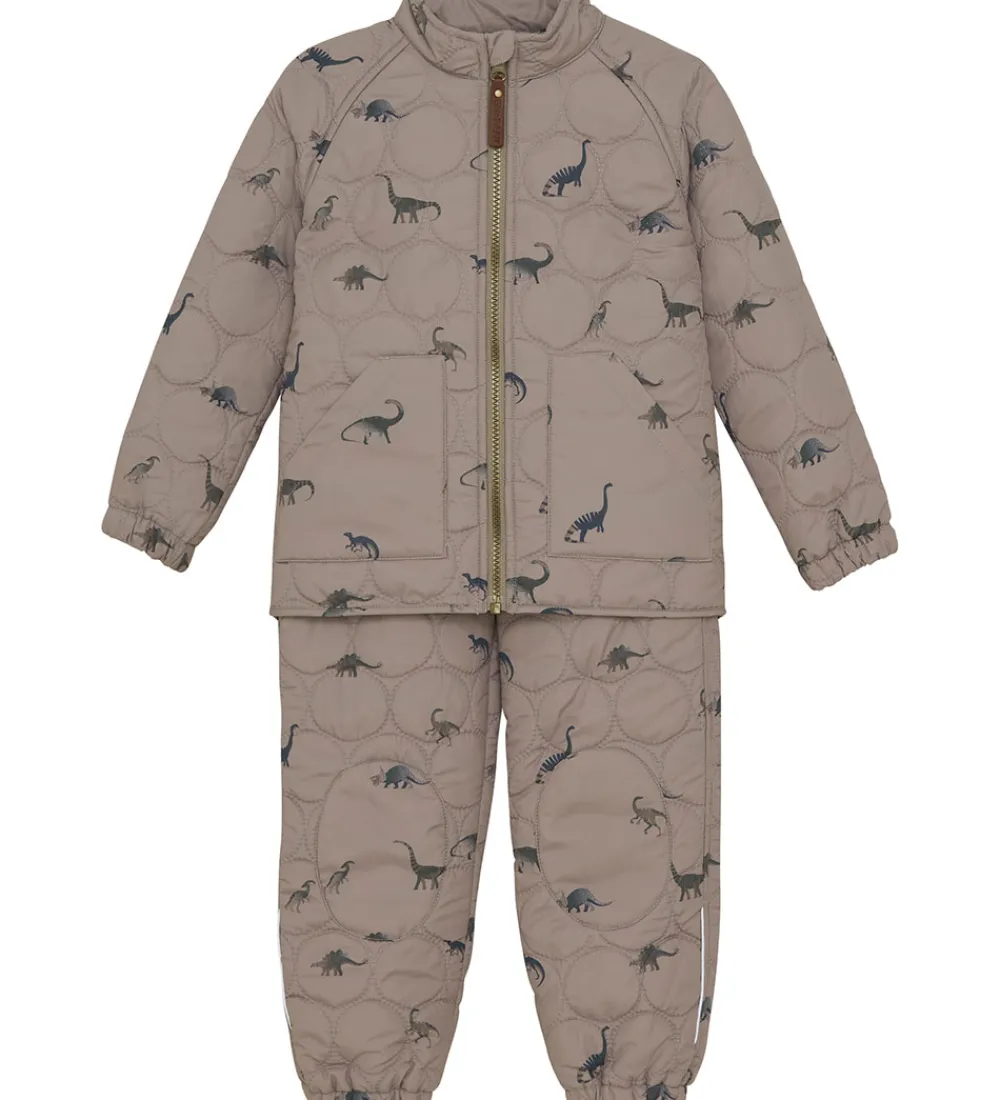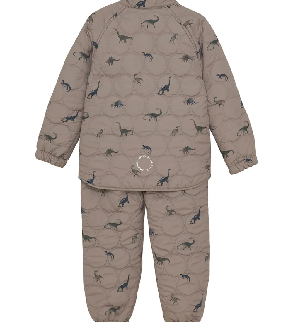 Fint En Fant termotøj i støvet brun med alloverdinoprint og med en indpræget, quiltet struktur i runde cirkler. Sættet består af en termojakke og et par termobukser.
