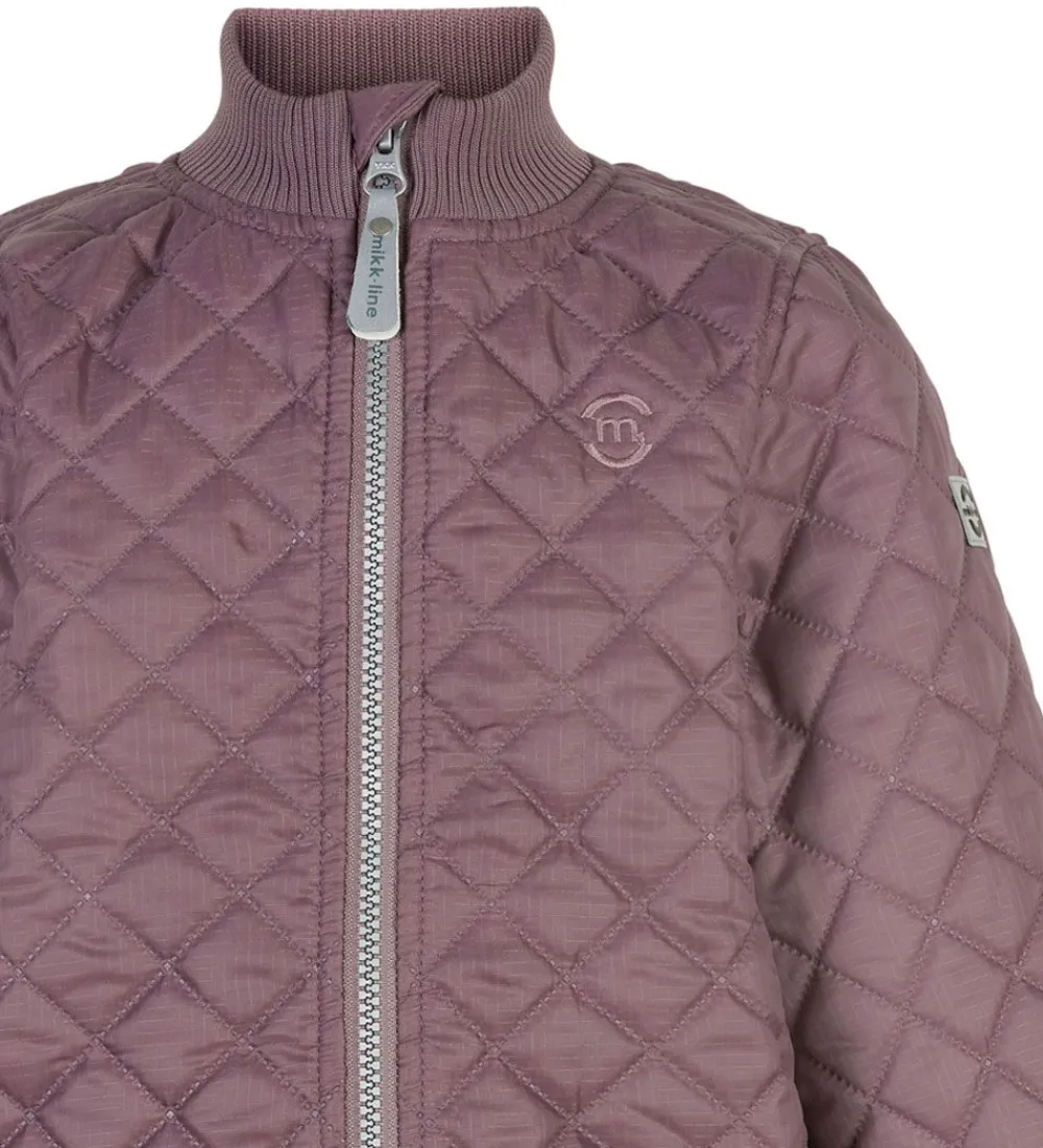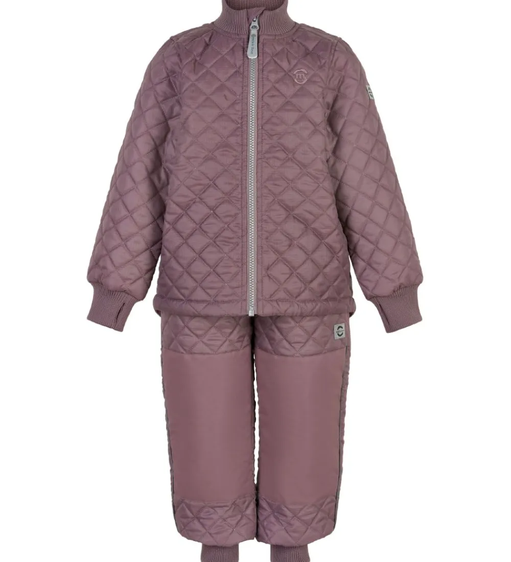 Fint Mikk-Line termotøj bestående af en termojakke og et par termobukser i støvet rosa i en glatvævet kvalitet og med en quiltet struktur.