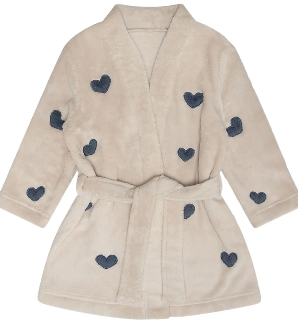 Blød That’s Mine badekåbe i lys beige med fine hjerteapplikationer i mørkeblå over hele kåben.