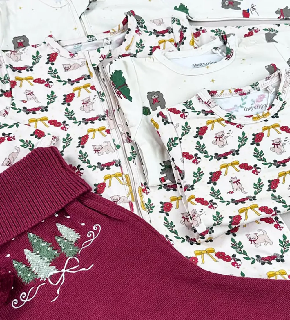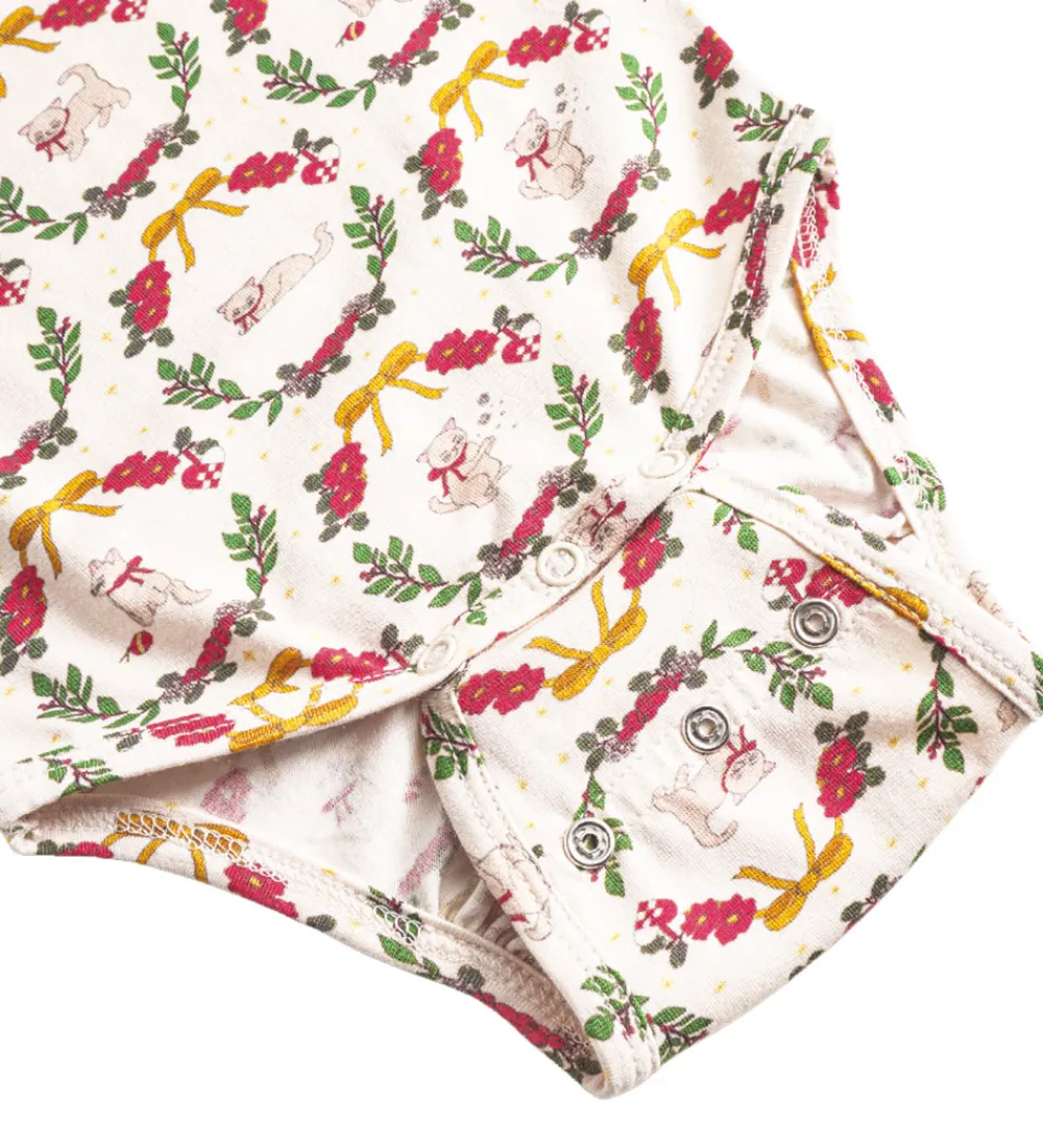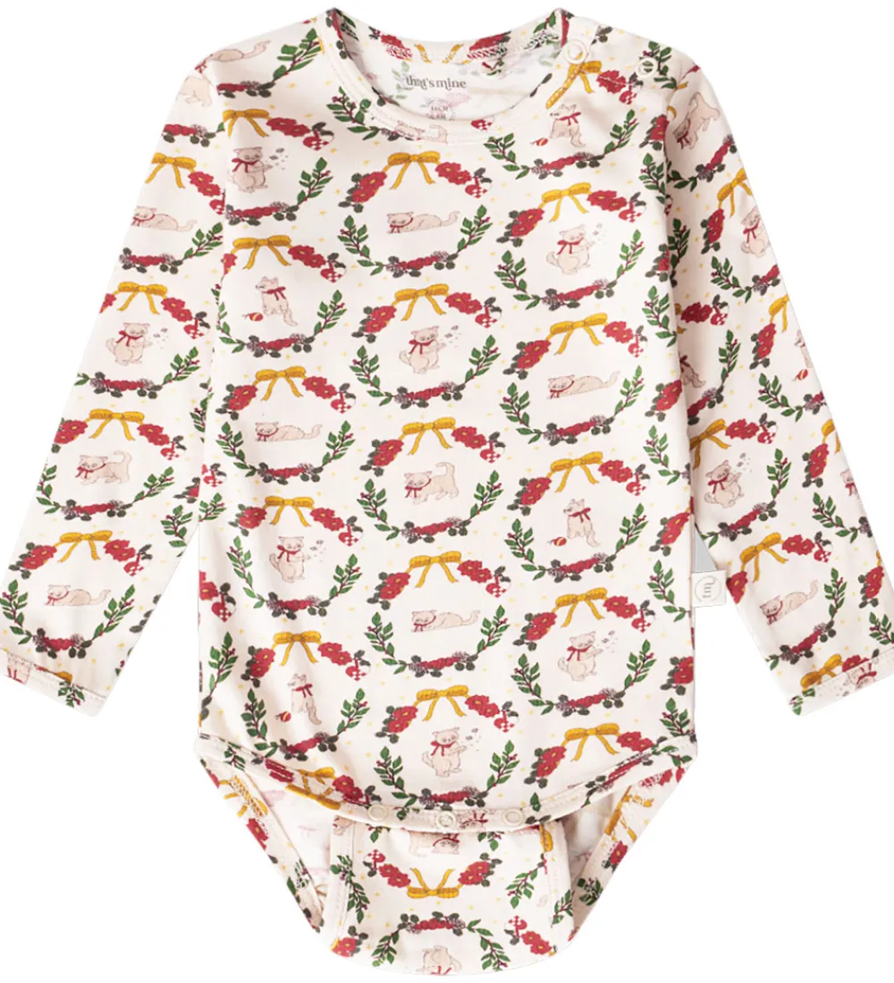 Charmerende Thats Mine body med lange ærmer, dekoreret med et detaljeret jule mønster af små katte, blomster, julehjerter og gule bånd på en cremefarvet baggrund. Bodyen fra Thats Mine har en blød rund halsudskæring og er smukt afsluttet med kanter ved ærmerne. Den praktiske knaplukning på venstre skulder samt i bunden sikrer nem af- og påtagning. I bunden er der to justeringsmuligheder med trykknapper.