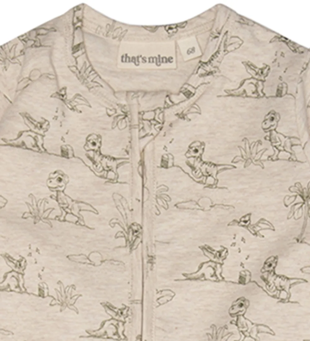 Smart That’s Mine heldragt i cremehvid med et opstreget, mørkegrønt alloverprint af musikglade dinoer.