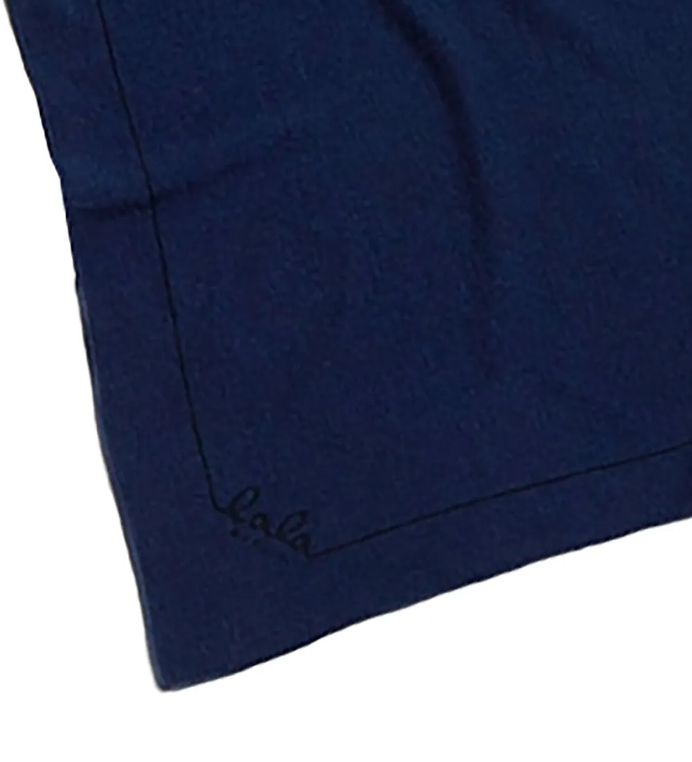 Lækkert Lala Berlin tørklæde i mørkeblå med en smal, sort stribe hele vejen rundt langs kanten, og ved spidsen står der “Lala Berlin”.