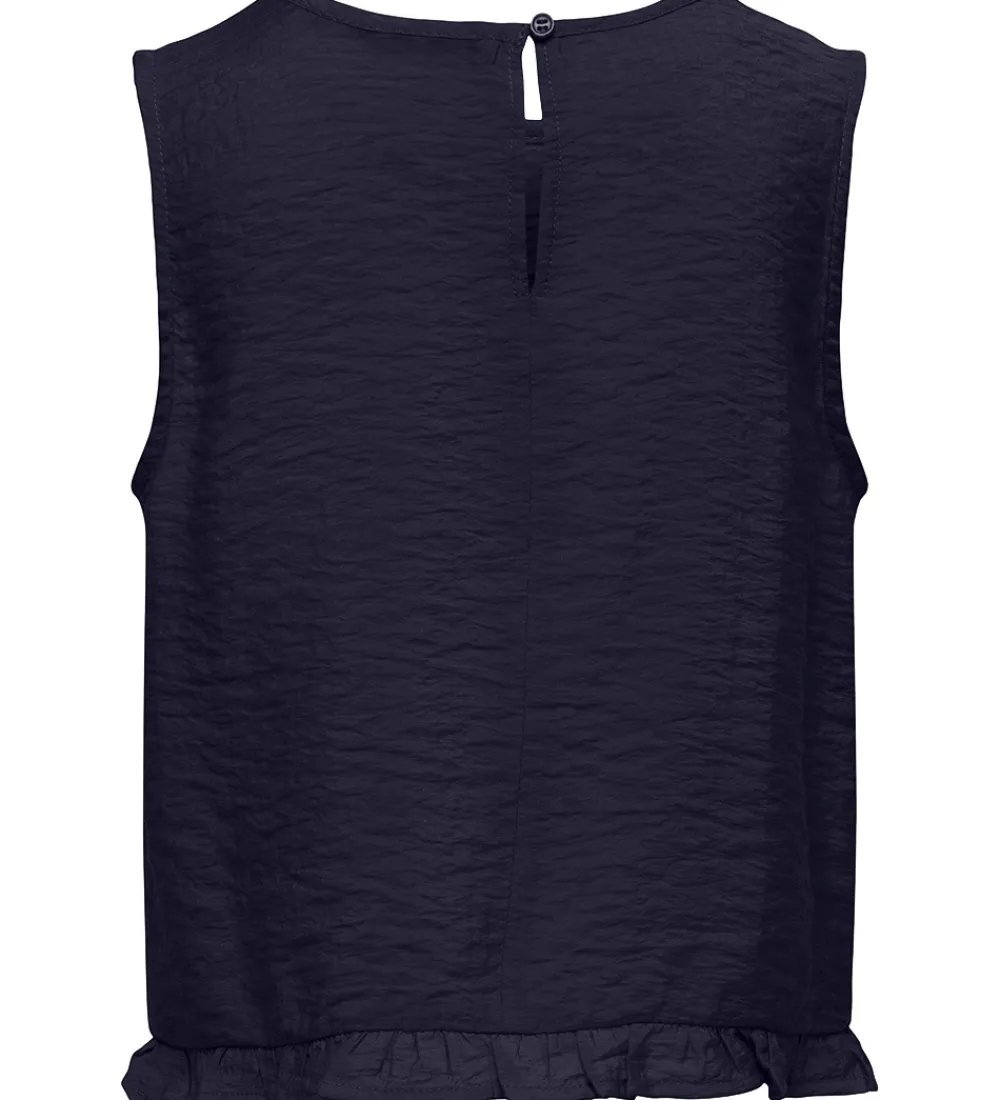 Kids Only toppen er uden ærmer og har brede skulderstropper. I bunden af toppen er der en smal flæsekant, og toppen kan åbnes i nakken med en knap i en dråbeform.