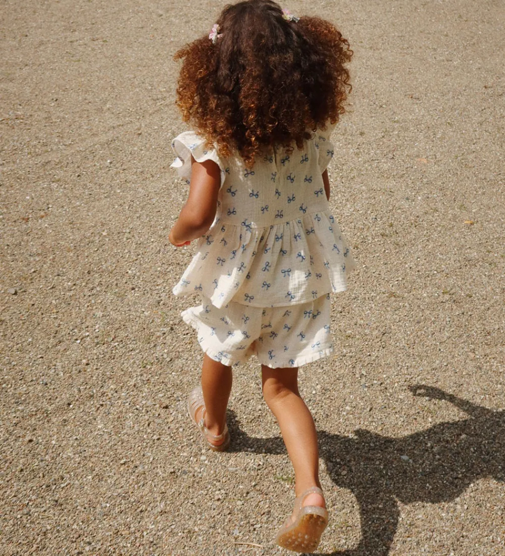 Elegant Konges Sløjd top i cremehvid med musselin-struktur. Toppen er dekoreret med et charmerende alloverprint af små, blå sløjfer. Konges Sløjd toppen har korte flæseærmer og en rund halsudskæring, der giver et enkelt og klassisk design.