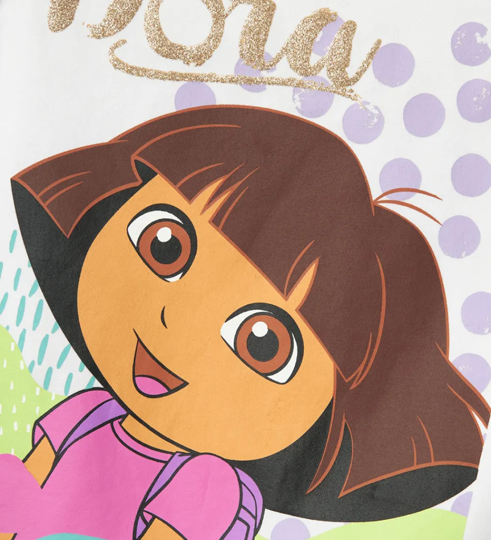 Sød Name It top i hvid med et stort print fortil af Dora, fra Dora the Explorer, omgivet af farverige blomster og med “Dora” skrevet i guldglitter øverst.