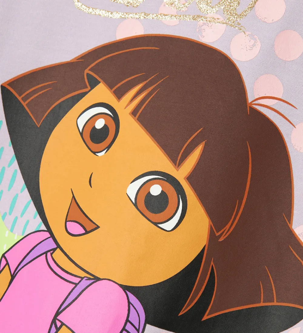 Sød Name It top i støvet lilla med et stort print fortil af Dora, fra Dora the Explorer, omgivet af farverige blomster og med “Dora” skrevet i guldglitter øverst.
