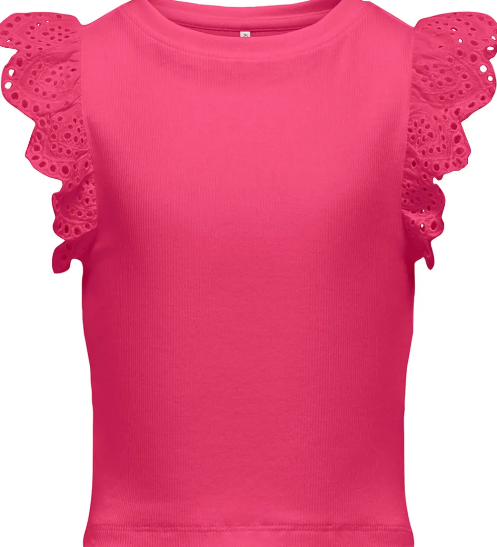 Elegant Kids Only top i en livlig, rosa farve med ribstruktur og broderi anglaise detaljer, som tilføjer et feminint og detaljerigt udtryk.