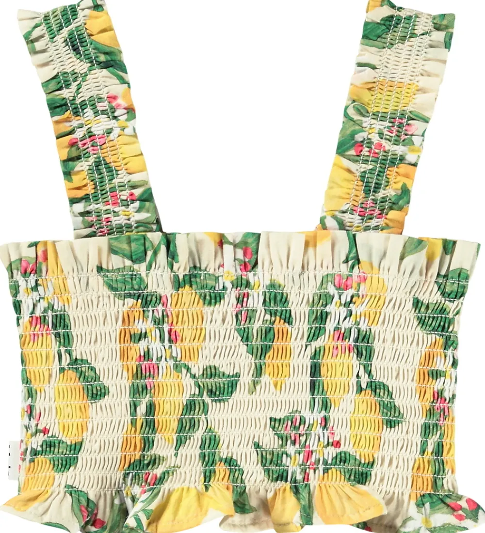 Smuk Molo top i lys beige med citronprint. Toppen er en kort model med smock og flæsekanter i top og bund. Den har brede skulderstropper.