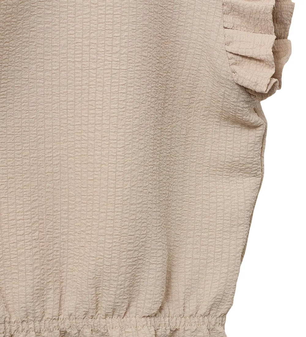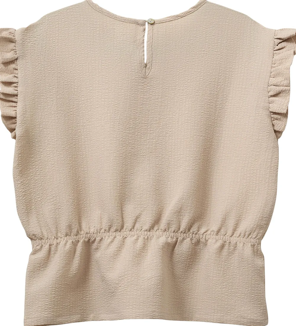 Flot Sofie Schnoor top i en lys beige nuance og med dekorativ struktur i stoffet. Toppen har fine flæsekanter langs ærmegab og i taljen er der en isyet elastik, som giver en flot pasform. I nakken er der en slids med knap- og elastiklukning ovenover.