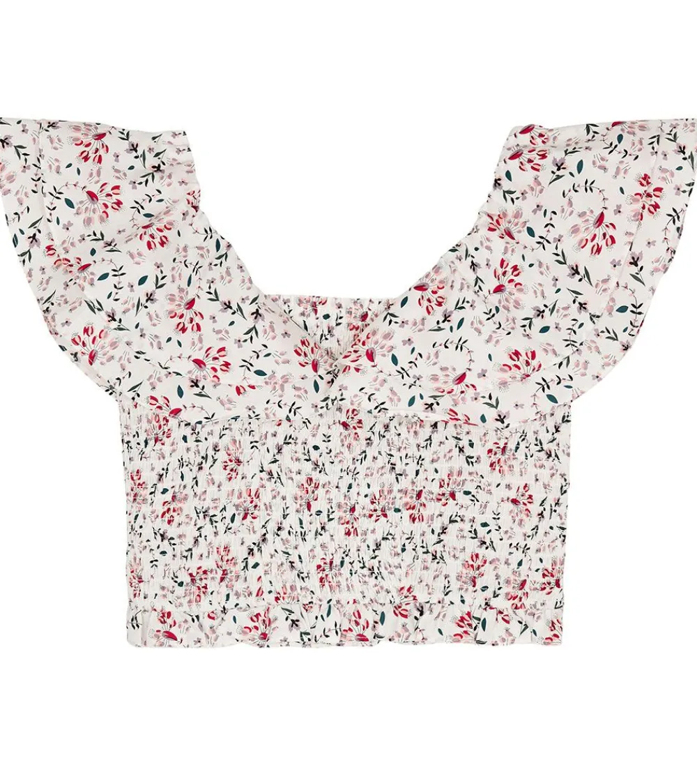 Designers Remix toppen er kort og har brede elastikker over skuldrene med skønne flæser, som giver et unikt look. Toppen er i smock-elastik, hvor der også er en smal flæse i bunden.