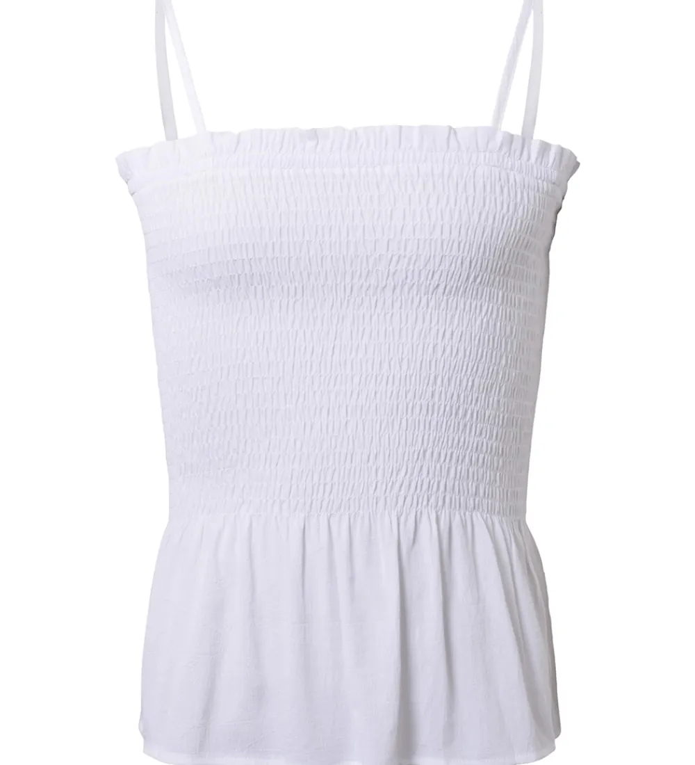 Hound toppen består af en bred smock syning med en flot, bred flæsekant nederst. Toppen er uden ærmer, og den har smalle, justerbare skulderstropper.