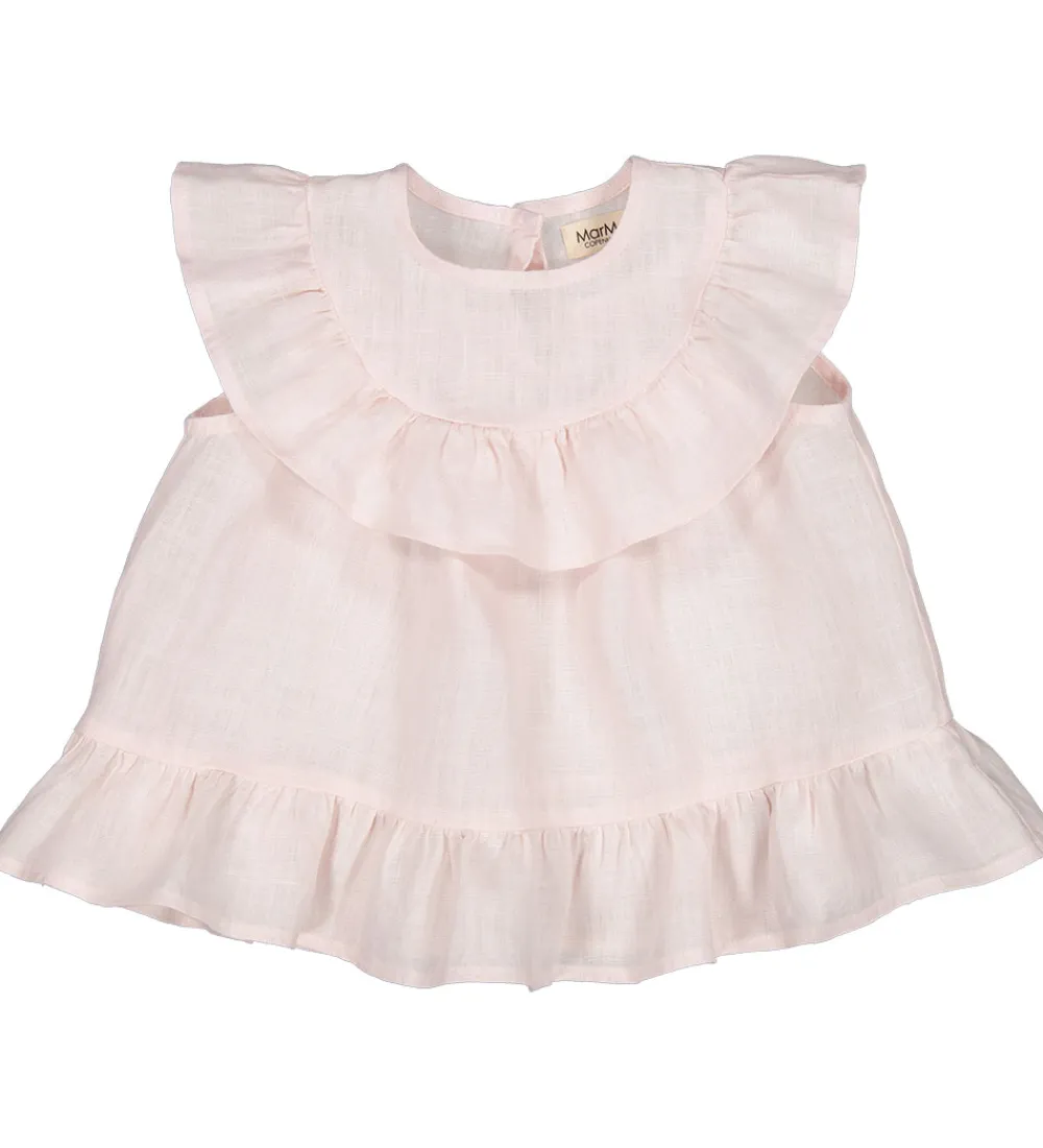 Skøn T-Shirt fra MarMar i en blød lys rosa med fine flæsekanter på skuldrene. T-Shirten har korte ærmer og giver et let og luftigt udtryk, perfekt til varme dage.