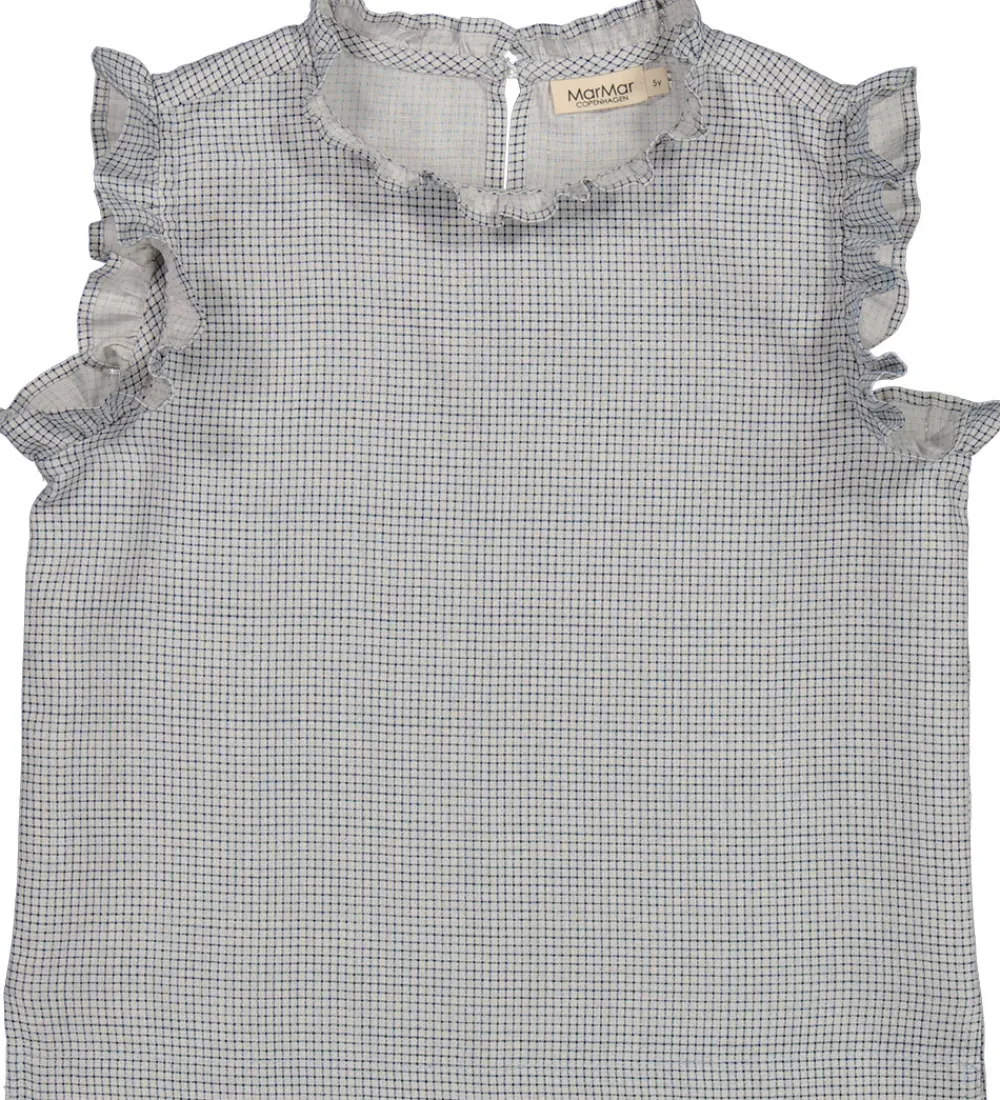 Lækker MarMar top i en blød grå farve med et fint ternet mønster. Toppen har en elegant flæsekant ved skuldrene, hvilket giver et sødt og stilfuldt udtryk. Den åbnes i nakken med en knap og elastik.