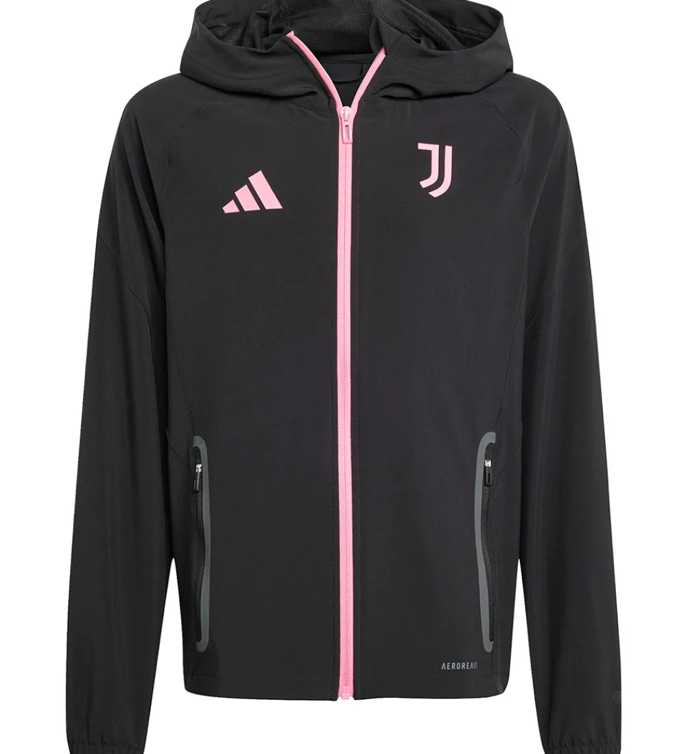 Flot adidas Performance træningsjakke i sort med rosa detaljer, og fortil i venstre side er der trykt et logo for den italienske fodboldklub Juventus.