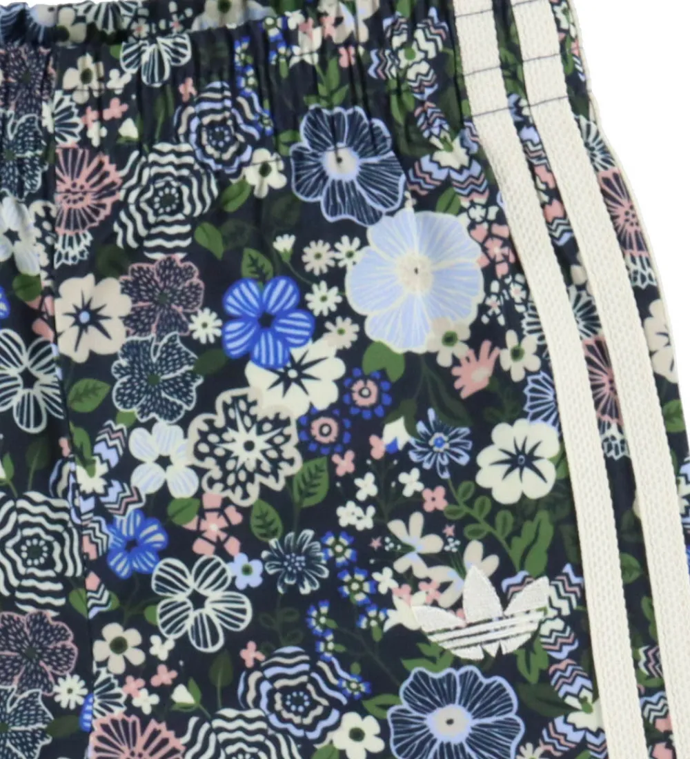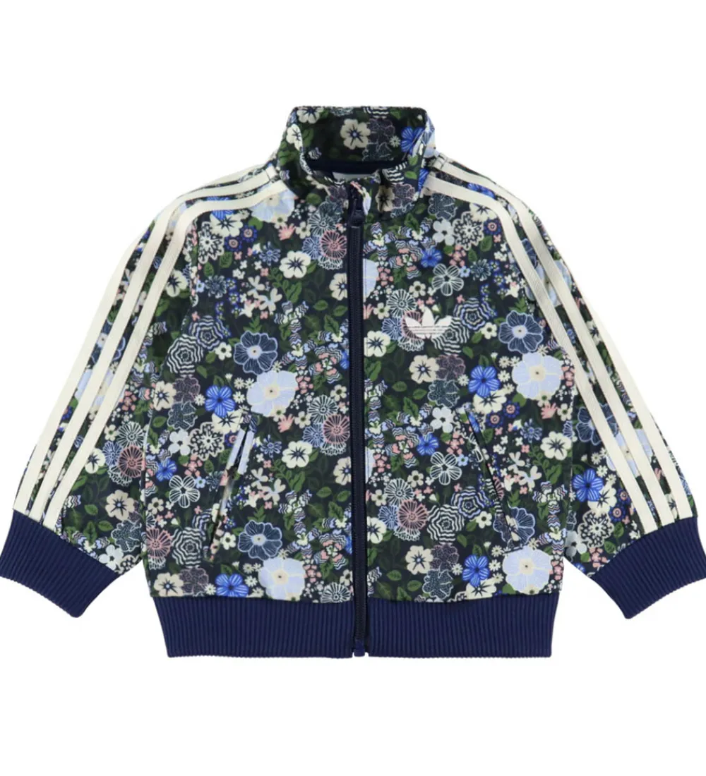 Flot adidas Originals træningssæt med et blomsterprint i blå, grønne, rosa og hvide nuancer. Træningssættet har de klassiske adidas striber ned langs ærmerne og benene, hvilket giver et stilfuldt look. Cardiganen har lange ærmer og åbnes fortil med en gennemgående lynlås med hagebeskytter. Den har ribkanter ved håndleddene, der sikrer en god pasform. Bukserne har en behagelig elastik i taljen, som sikrer en god justering samt samme flotte mønster, der matcher overdelen perfekt.