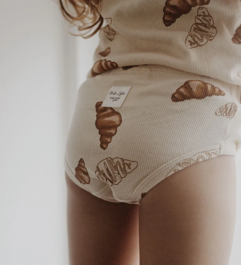Flotte VACVAC trusser i en 2-pak med ribbet struktur og et skønt print af croissanter i brune nuancer på en lys beige baggrund. VACVAC trusserne har bred elastikkant i livet og smalle ribkanter ved benåbningerne for en god pasform.