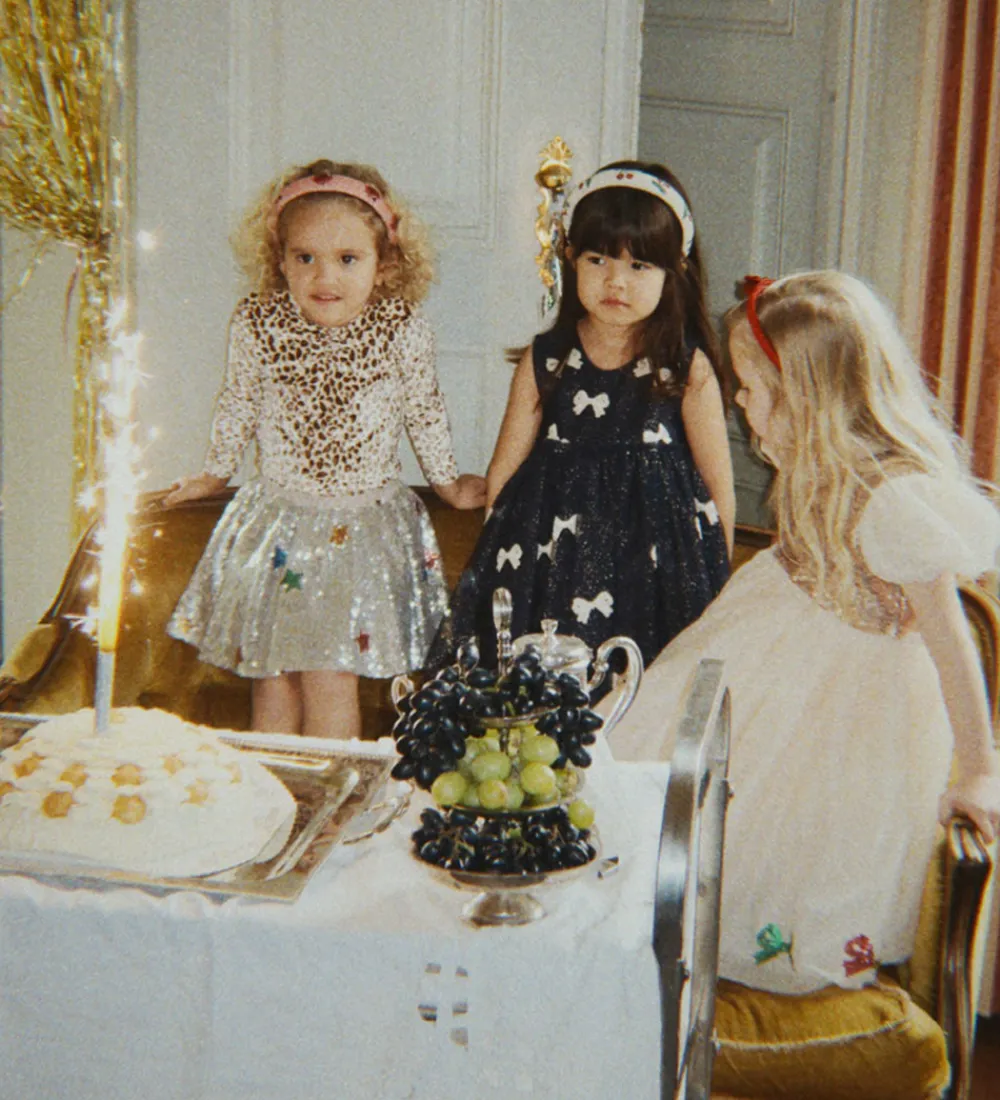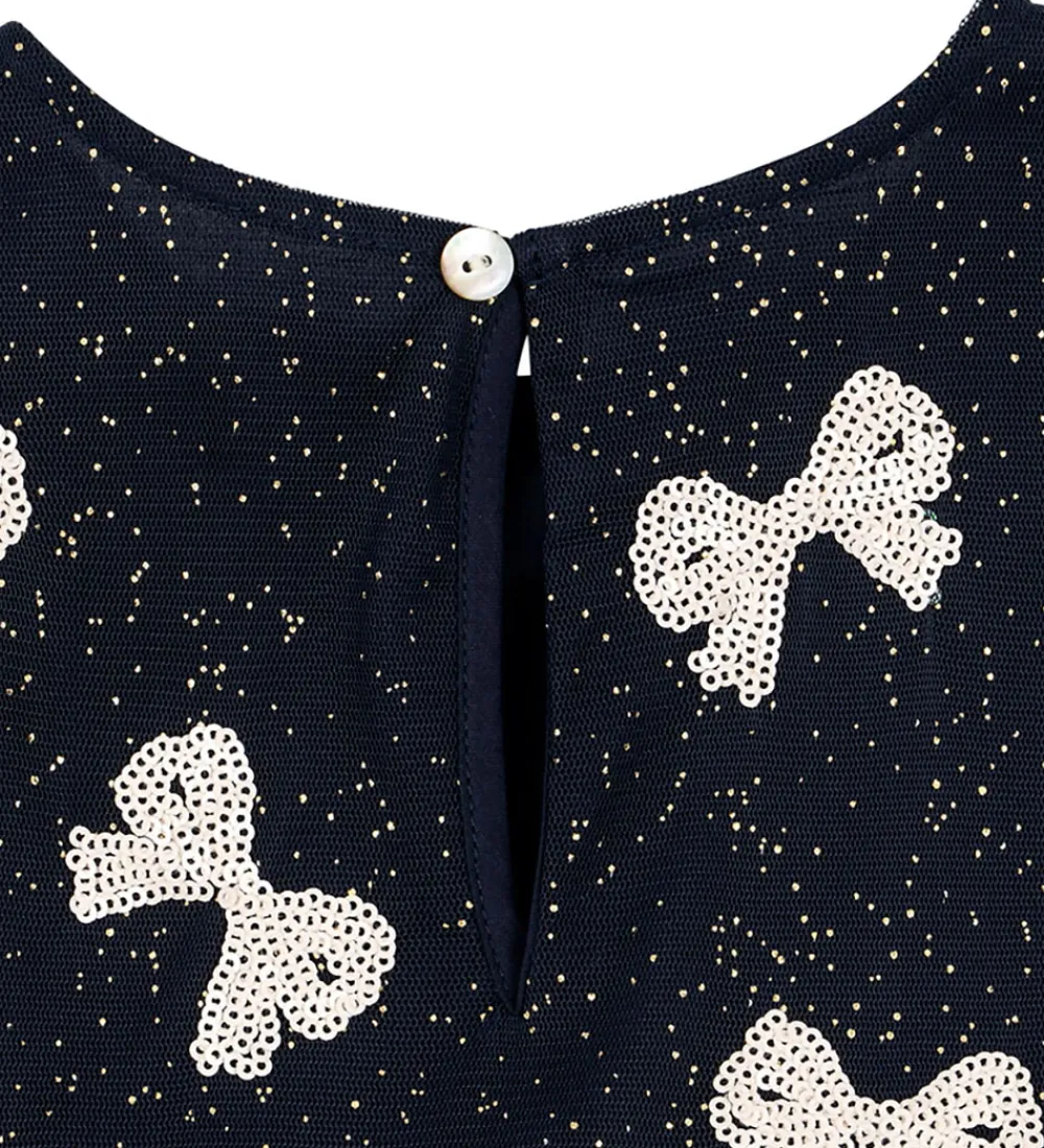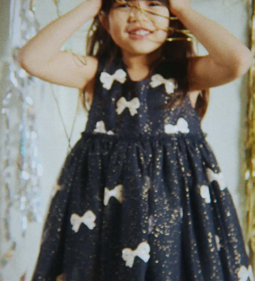 Elegant Konges Sløjd kjole i navy med guldglimmer og pudderrosa sløjfer lavet af pailletter. Tylkjolen er helt uden ærmer, og den har et skørt med masser af viddet. Konges Sløjd kjolen lukkes i nakken med en knap, og den har bomuld på indersiden.
