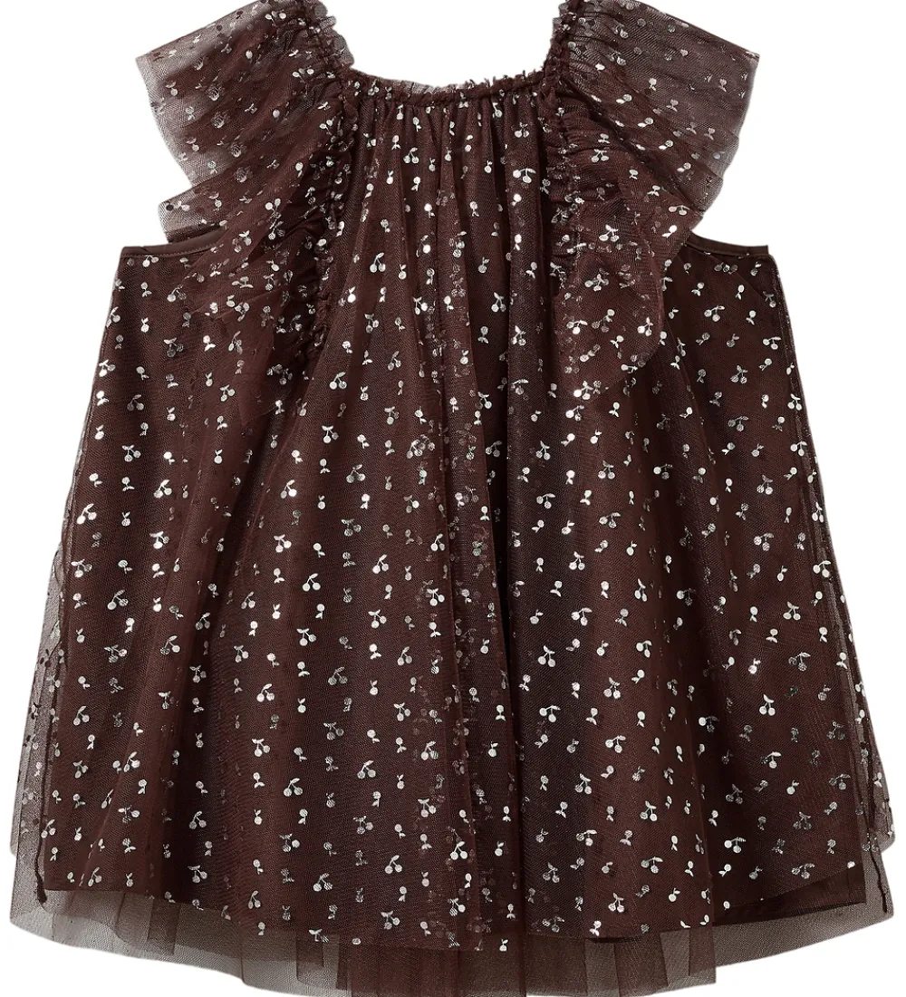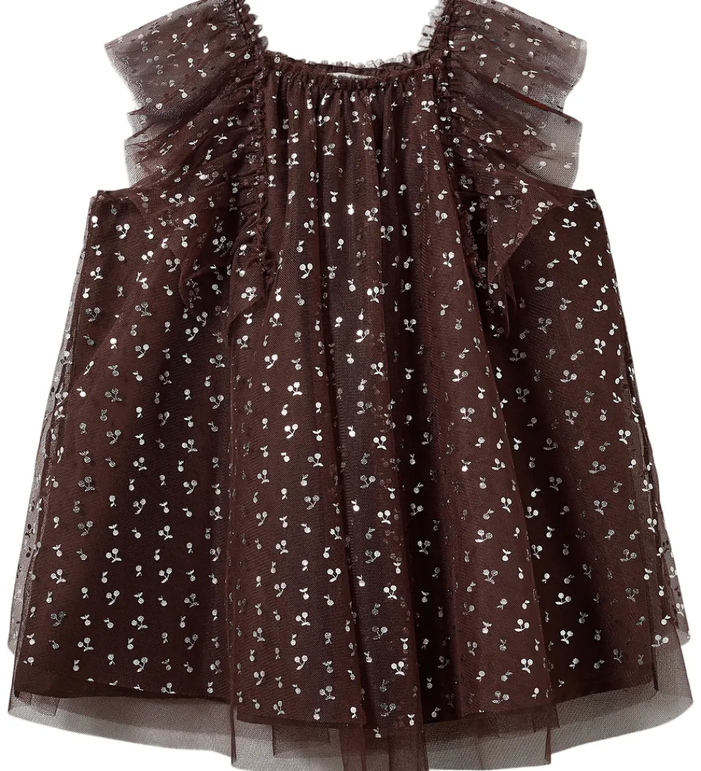 Sofie Schnoor tylkjolen har en luftig tyl-struktur med flæser omkring ærmerne, der giver et sofistikeret udtryk. Materialet er let og gennemsigtigt med en underkjole, der sikrer god dækning. Kjolen har en rund halsudskæring.