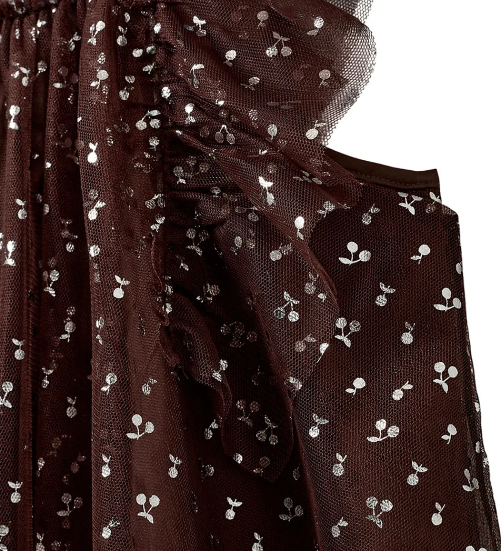 Elegant Sofie Schnoor tylkjole i en rødbrun nuance med et delikat mønster af små sølvfarvede kirsebær.